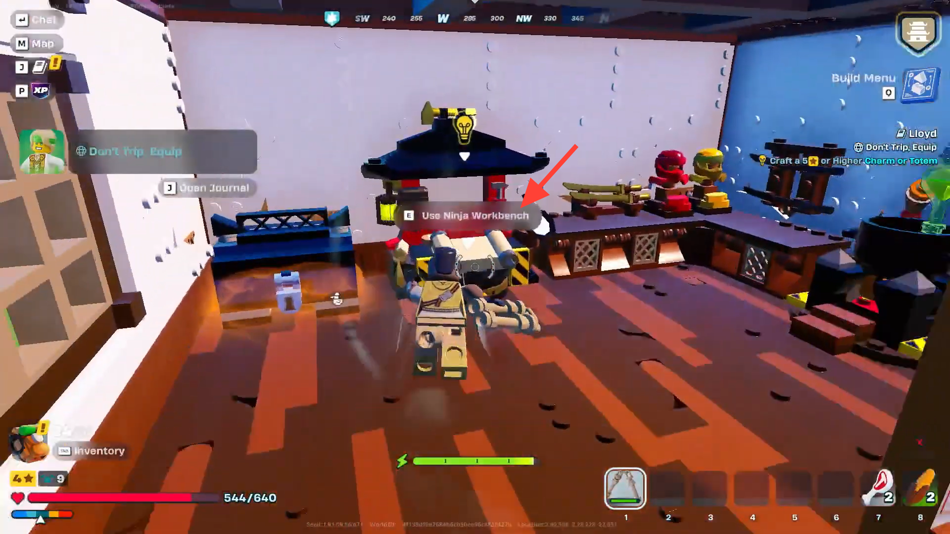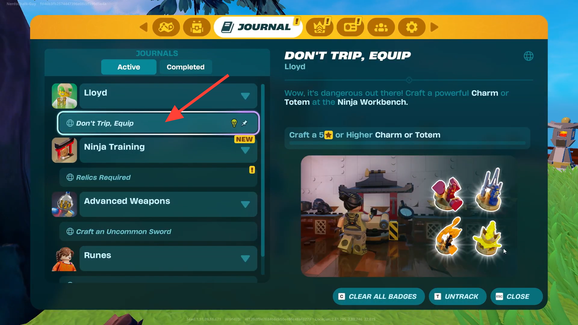 Don’t Trip, Equip is an early progression quest in Fortnite LEGO Ninjago given by Lloyd, designed to introduce charms and totems. This quest challenges players to craft a powerful charm or totem with a 5-star or higher rating using the Ninja Workbench.