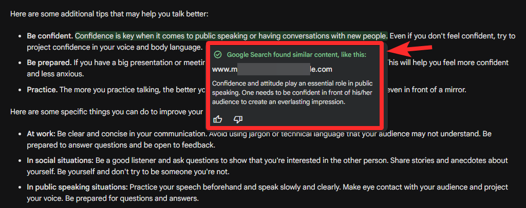 - Green background: Google found similar content to the statement. A link is provided but it might not have been Bard’s source.