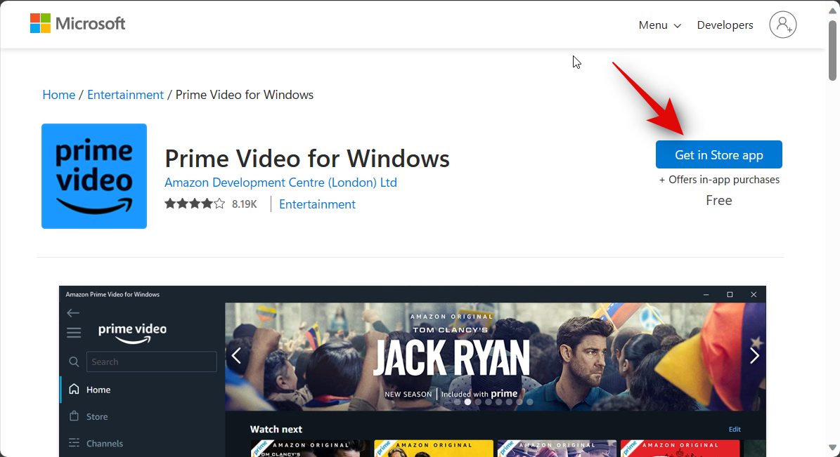 Open the link below by clicking on it. You will be redirected to the Microsoft Store web page for the Amazon Prime Video app. Click on Get in Store app.