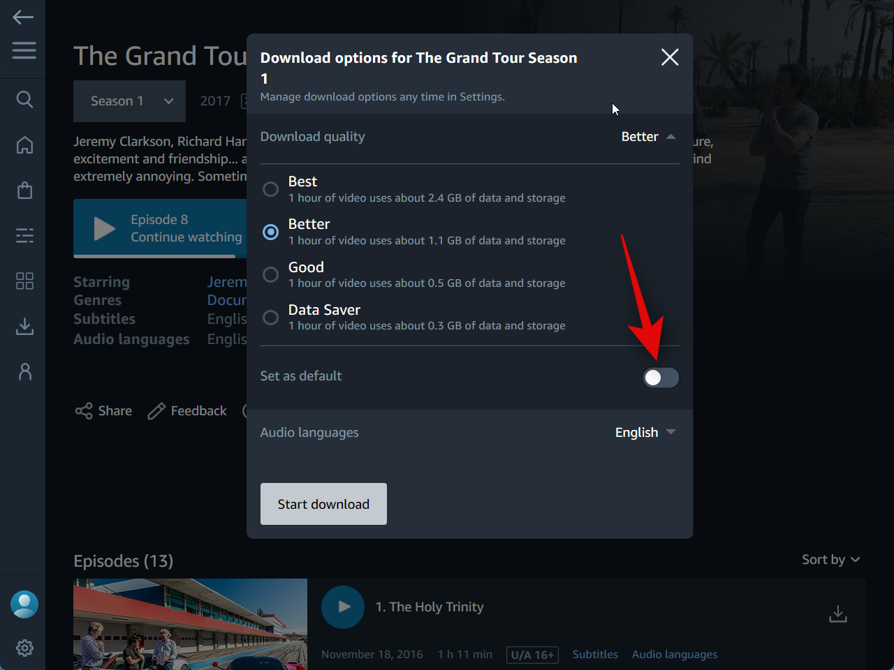 You can click and turn on the toggle for Set as default to set the selected quality as your default download quality.