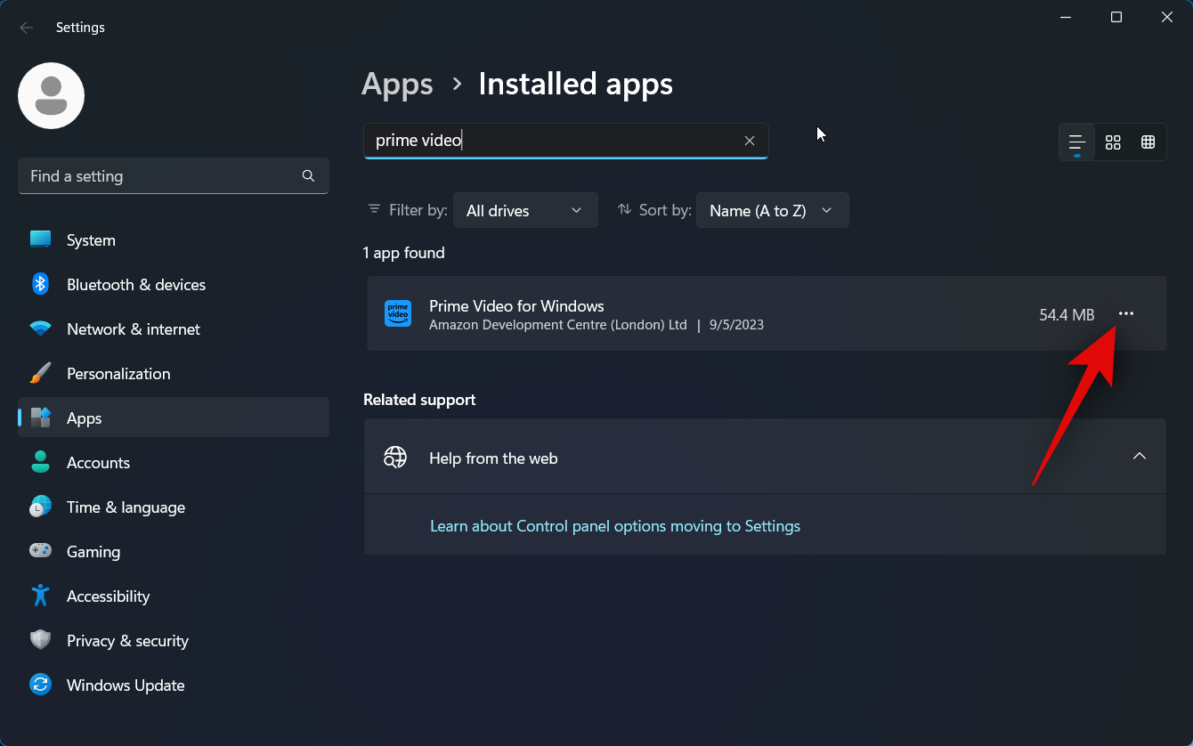 Click the 3-dot () icon beside Prime Video for Windows from the search results.