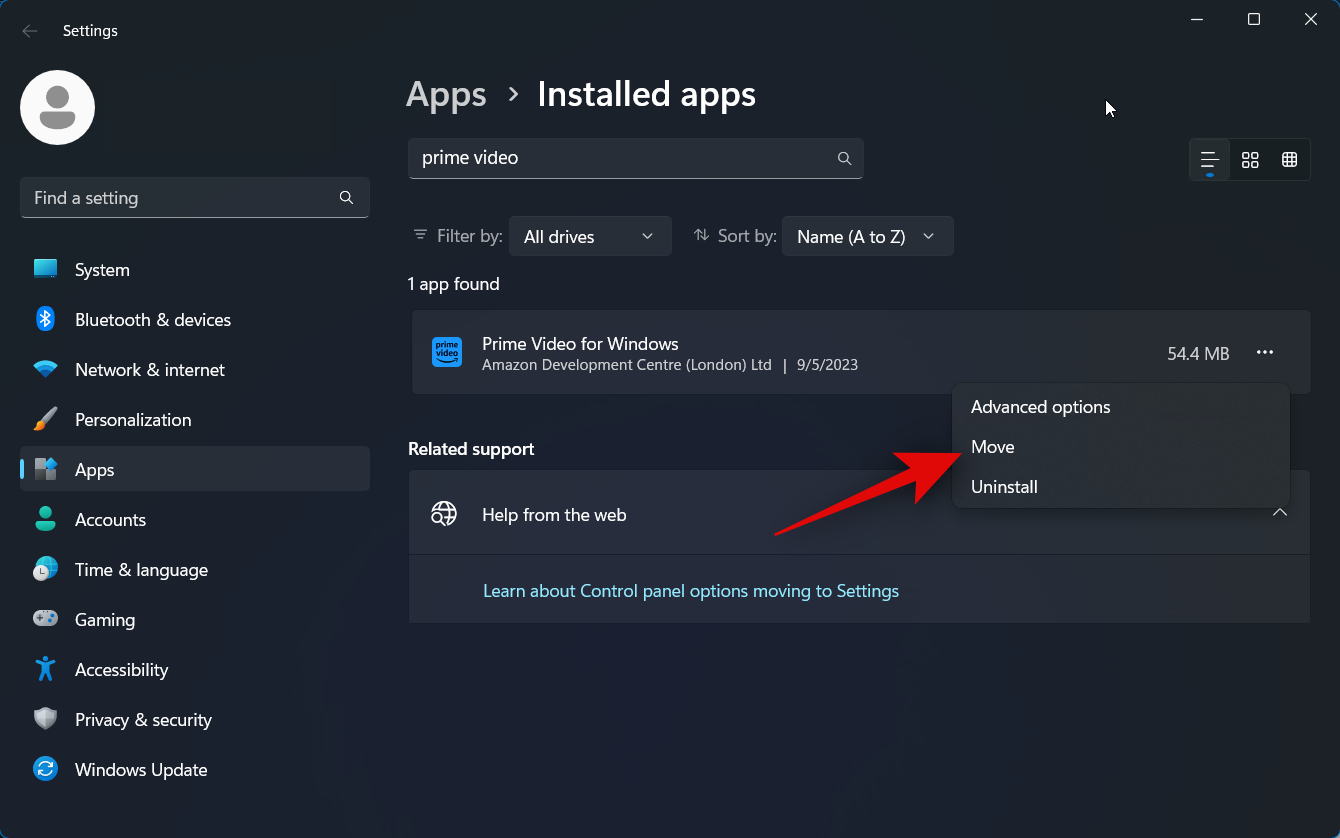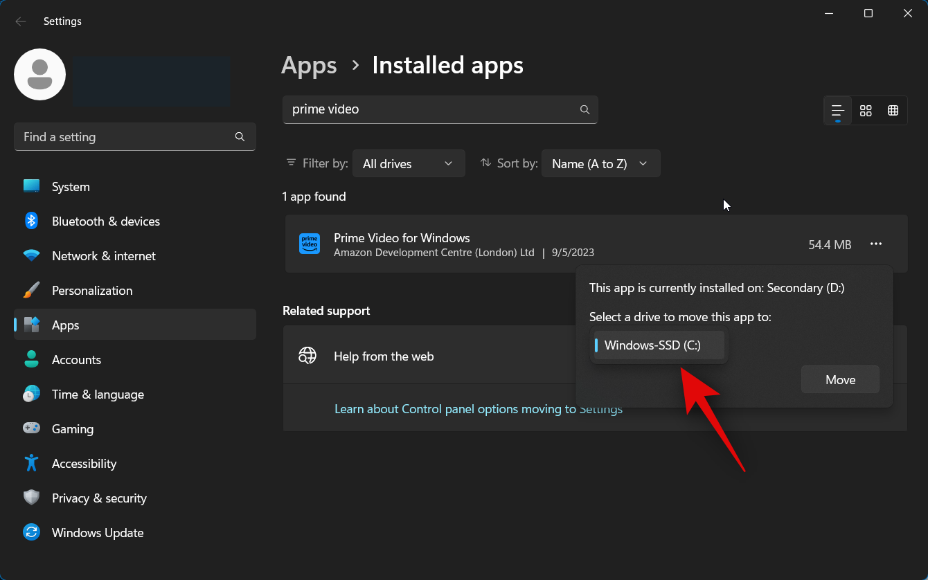 Click on the drop-down menu under Select a drive to move this app to: to change the drive where downloads and the Prime Video app are stored.
