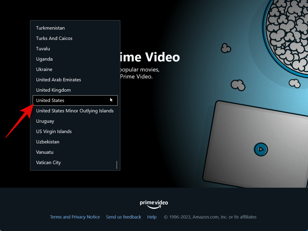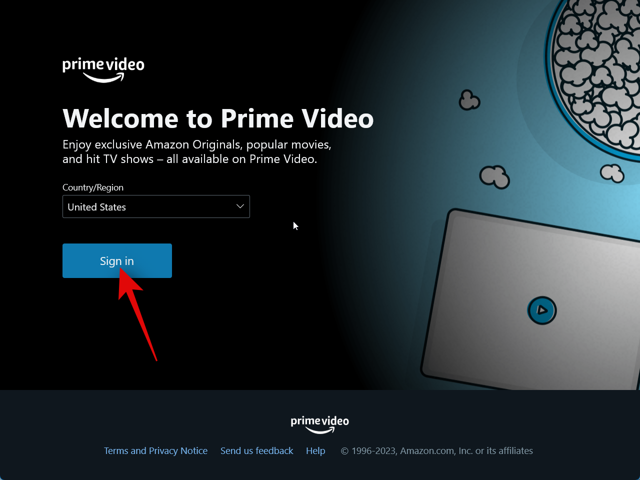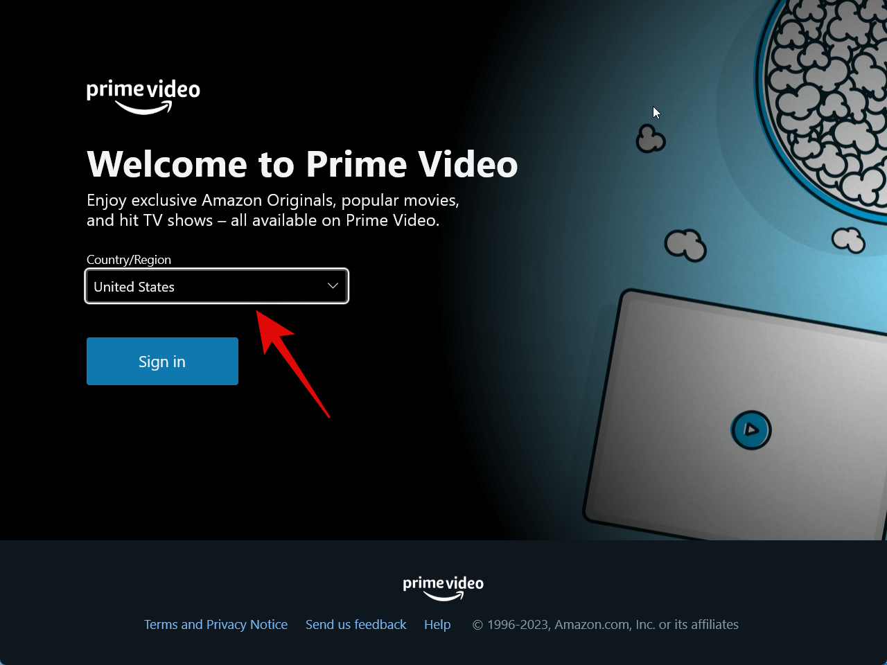 The Prime Video app will now open on your PC. Click the drop-down menu for Country/Region.