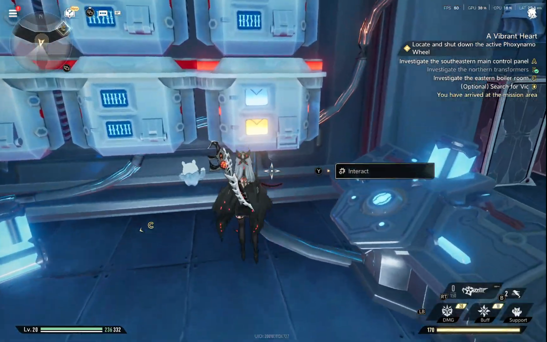 Interact with the central control panel to disable the defense barrier and gain access to the Phoxynamo area.
