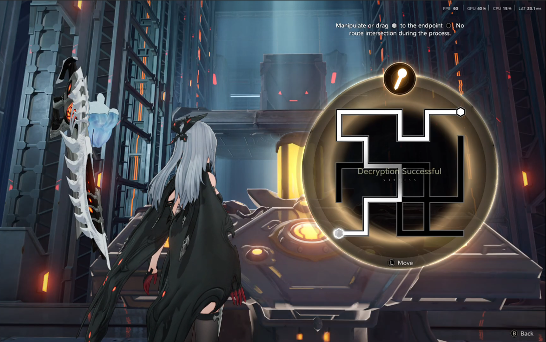 Interact with the lift terminal to trigger a decryption puzzle. Manipulate the lines to connect the start and endpoint without overlapping routes. Once successful, you’ll unlock access to the cargo lift controls.