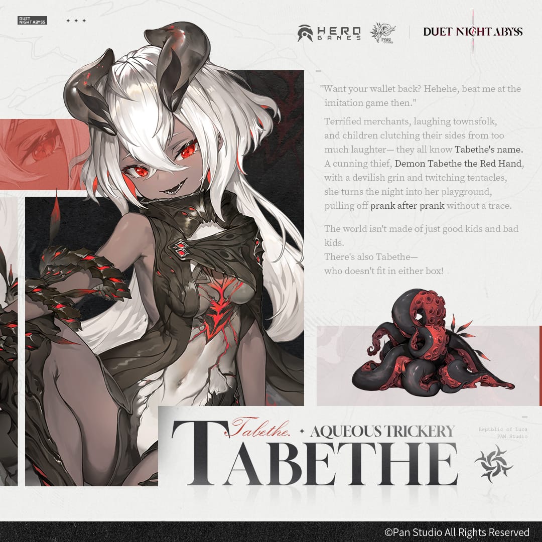 Tabethe combines ranged magic and physical tentacle attacks, similar to the way the character Hydroid functions in Warframe. She can teleport short distances using her tentacles, enhancing her mobility and positioning in multi-dimensional combat.
