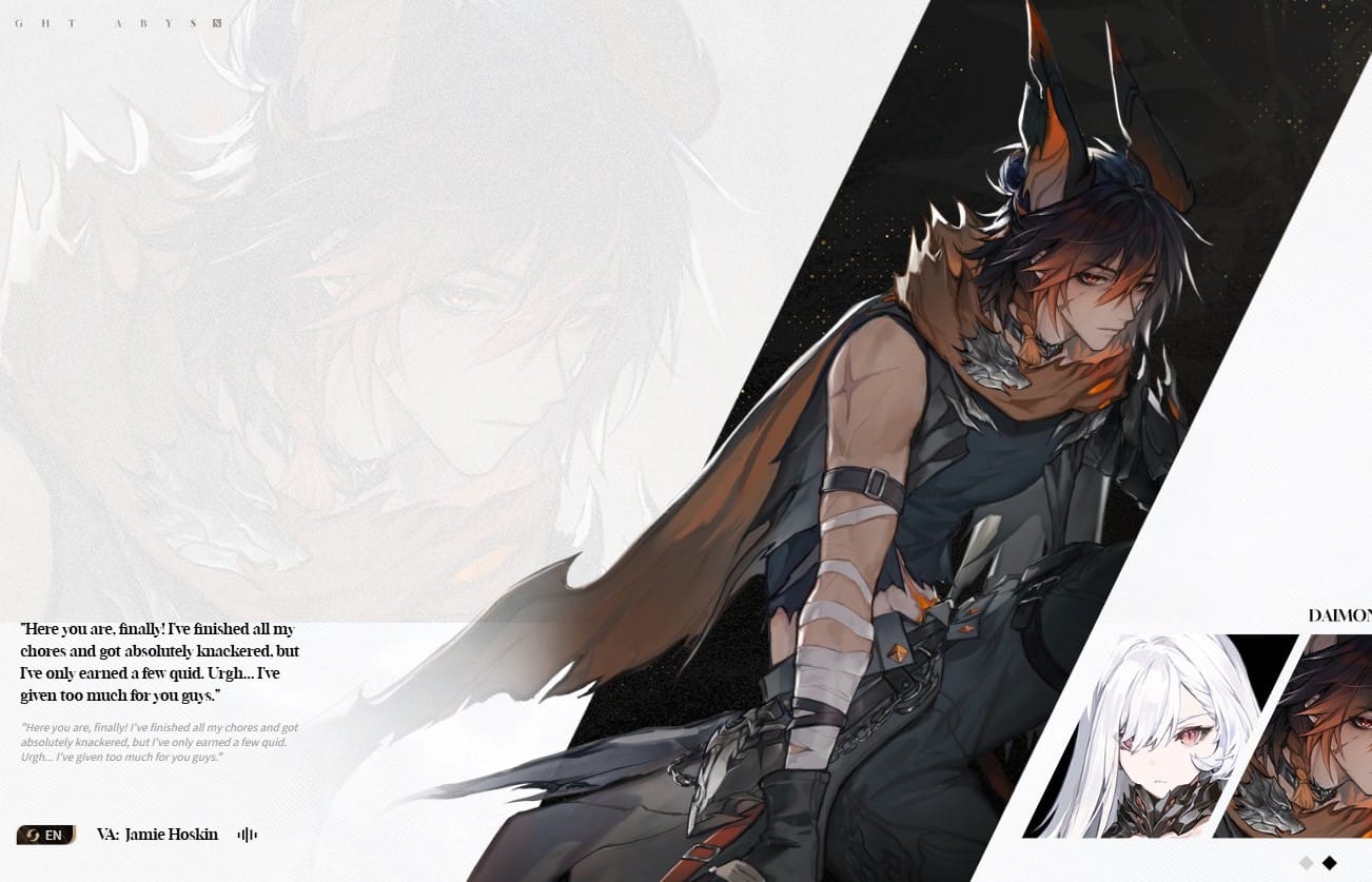 Outsider channels Anemo element powers as a piscator with empathetic impression traits. Affiliated with the Noctoyagers, Outsider operates as a weapon damage specialist through Dual Blades and Dual Pistols. His Stealth state enables tactical positioning and generates Fang Spikes to attack nearby enemies when entering or exiting this state.