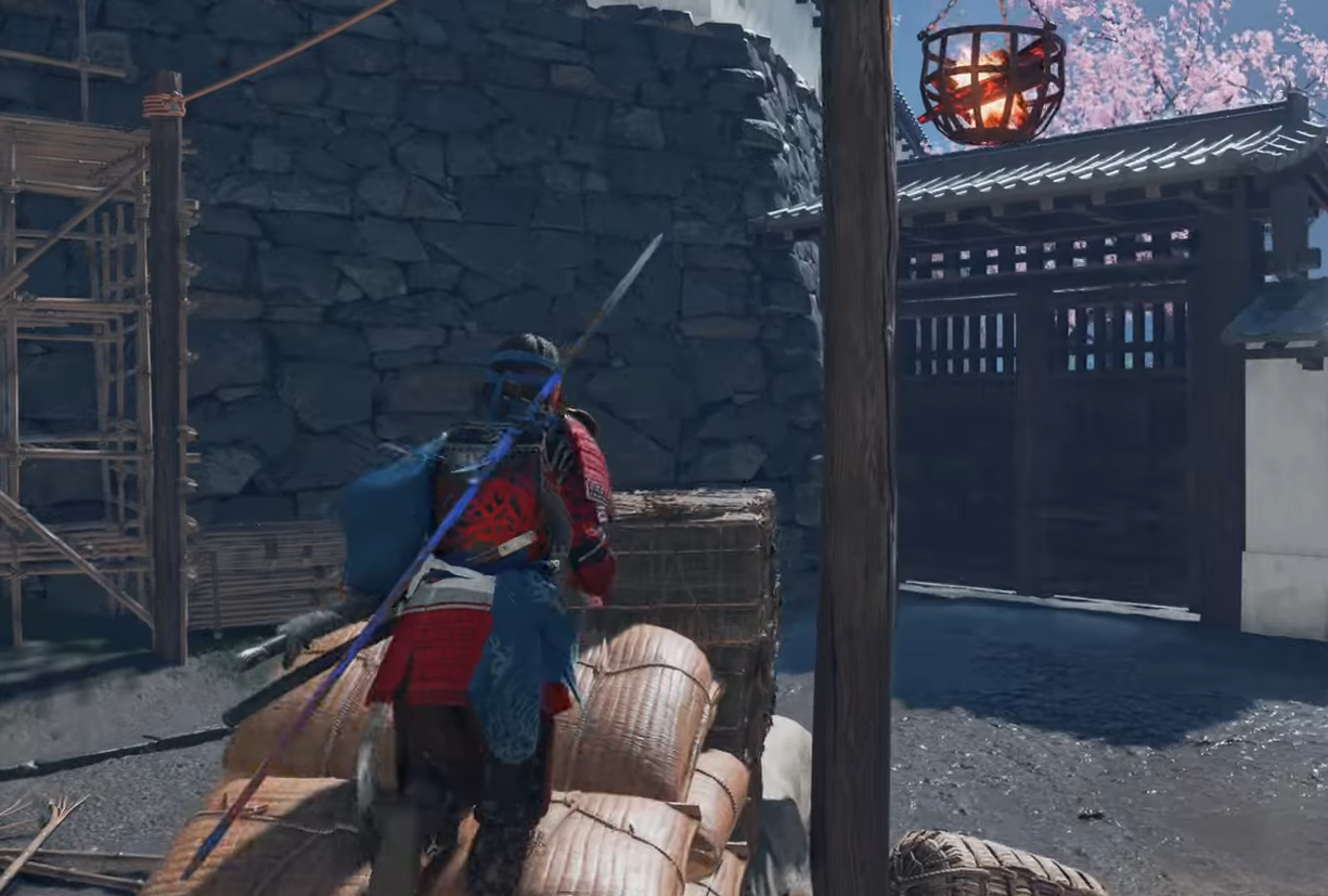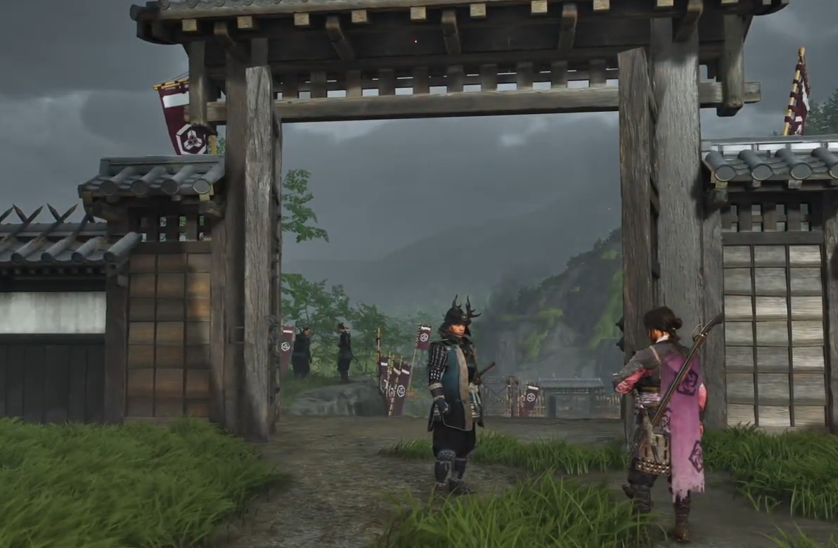 Follow the Matsumae soldier at Benten Port into the outer approaches of Matsumae Castle — stay close, keep an eye on patrol paths, and use cover to avoid unnecessary alerts.