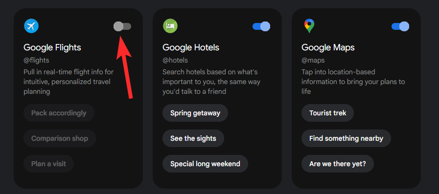 With extensions, Gemini gives you up-to-the-minute details from Google Maps, Flights, Hotels, and YouTube. Once you enable an extension for Gemini for a particular app, it can pull up data from your account for the app and assist you even more.
