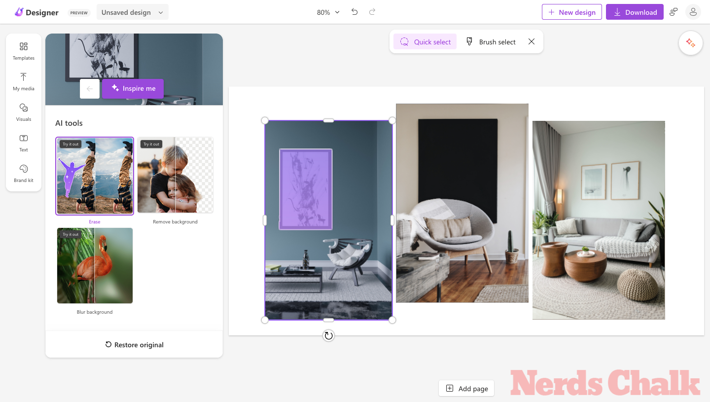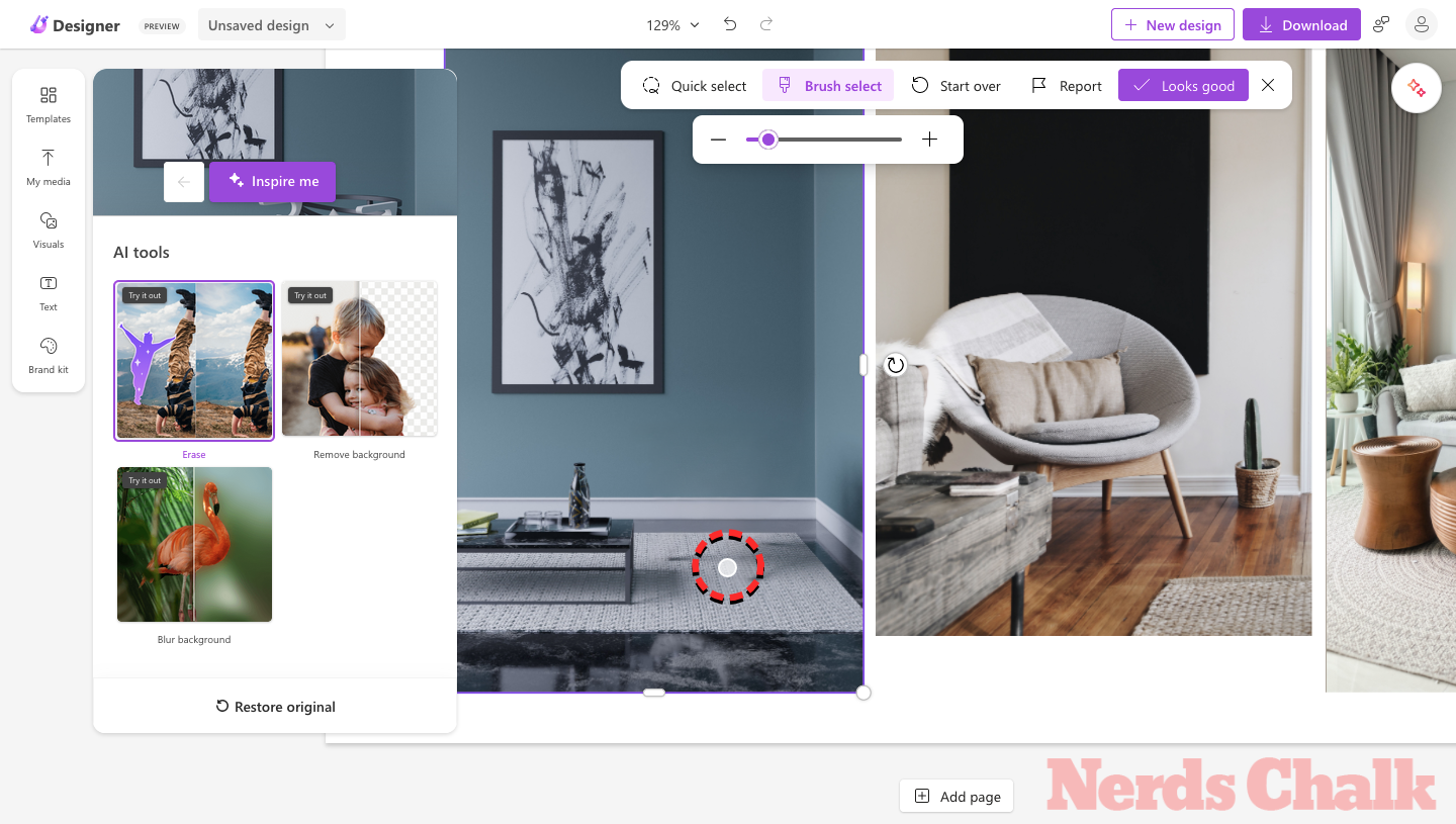 • Designer also offers a Brush select option to let you manually choose a portion of the image to erase or use it to remove portions that weren’t selected by the Quick select option.