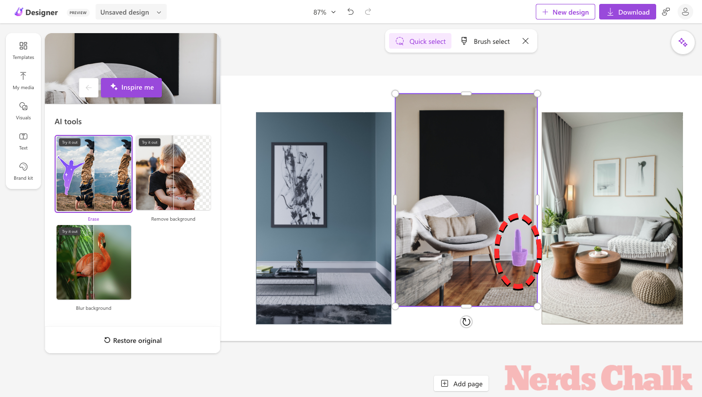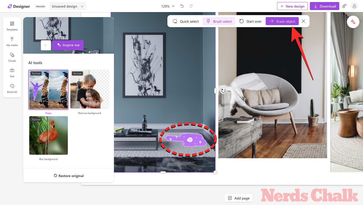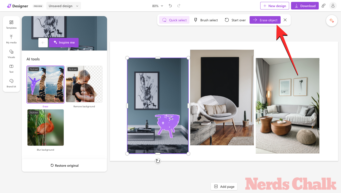 To select the unwanted portions manually, click and drag the brush around the desired area. When you’ve covered the desired portion, it will be highlighted. You can then click on the Erase object button at the top to request the Designer AI to delete it.
