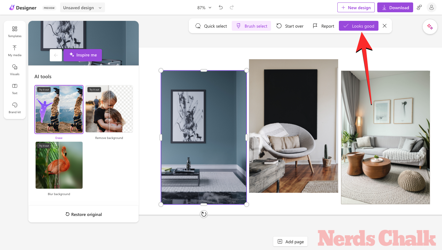 The Designer tool will now remove the selected object from the image. If you’re satisfied with the result, you can click on Looks good at the top to save changes or you can move to Step 2 below to remove the object’s residues.