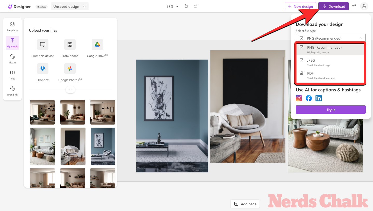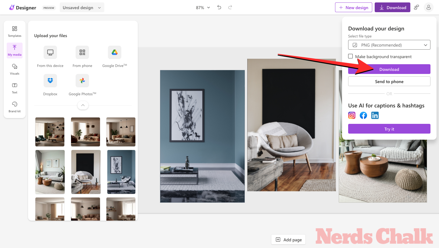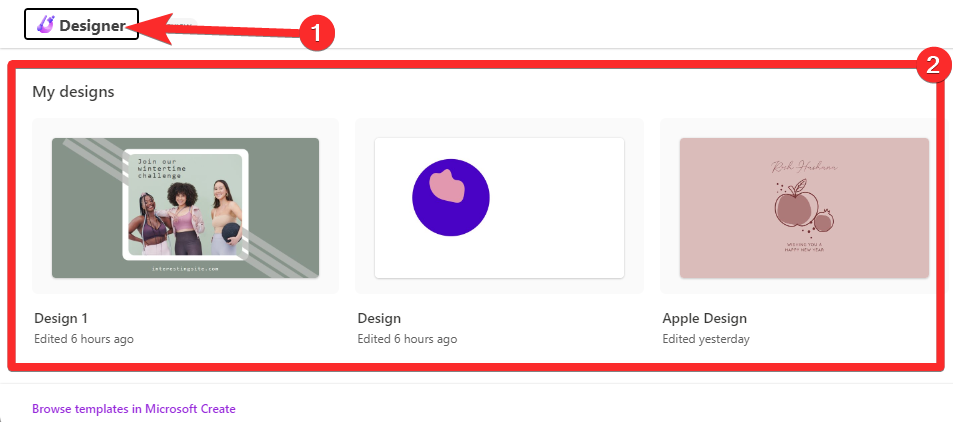 Or, if you have a design on Microsoft Design itself, then open it by going to My Designs. For this, simply click the Designer logo in the top right and then select the design from the My Designs popup that will open.