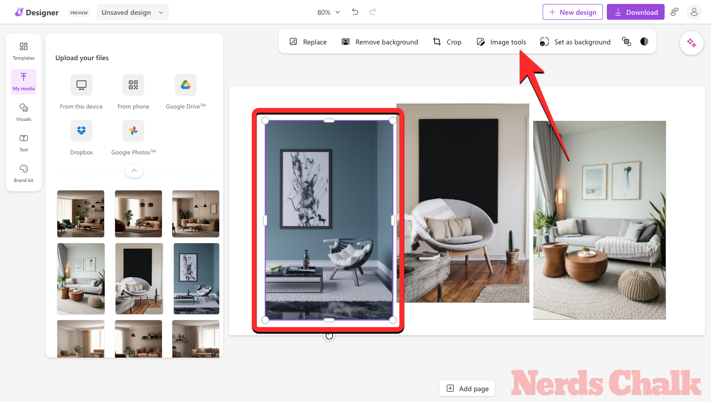 Once you’ve added the images to your design, select the image you want to edit and click on Image tools from the toolbar at the top.
