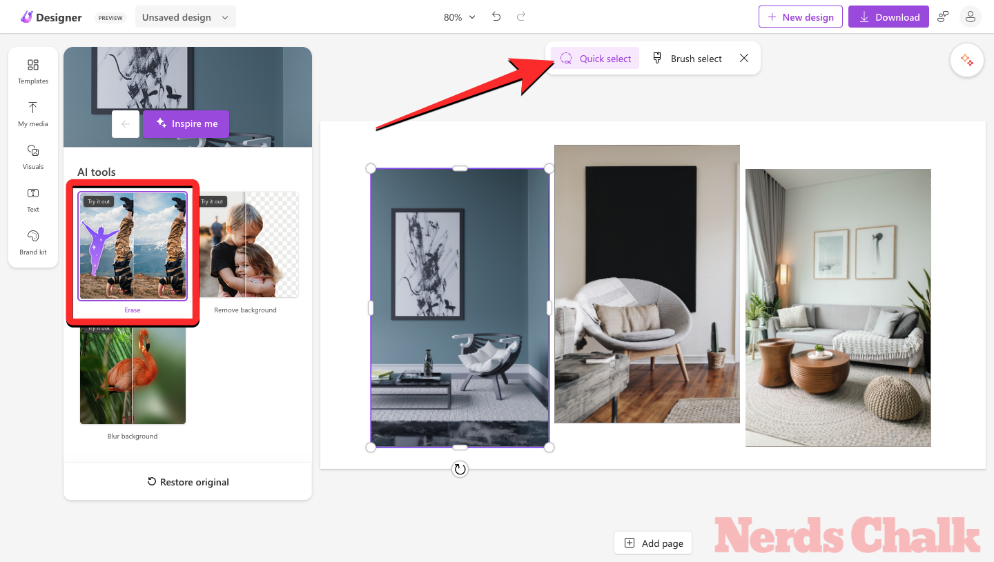You will now see the AI tool sidebar on the left. From here, click on Erase and then click on Quick select at the top.