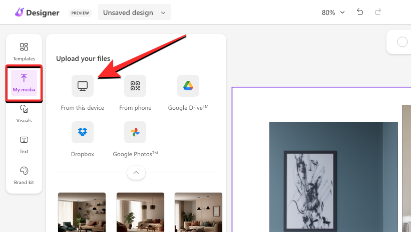 When you’re signed in, open the image you want to remove objects from in Microsoft Designer. If you have the image on your PC, then get it via My Media > From this device.
