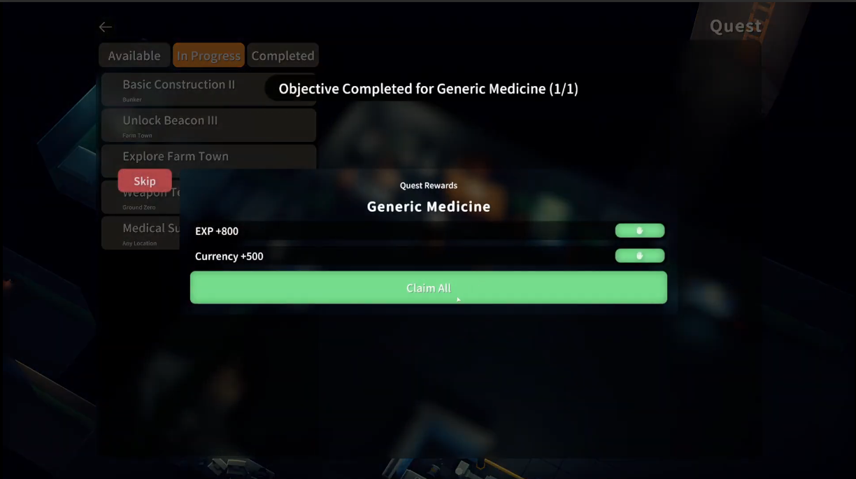 After submitting, complete the quest and claim the rewards.