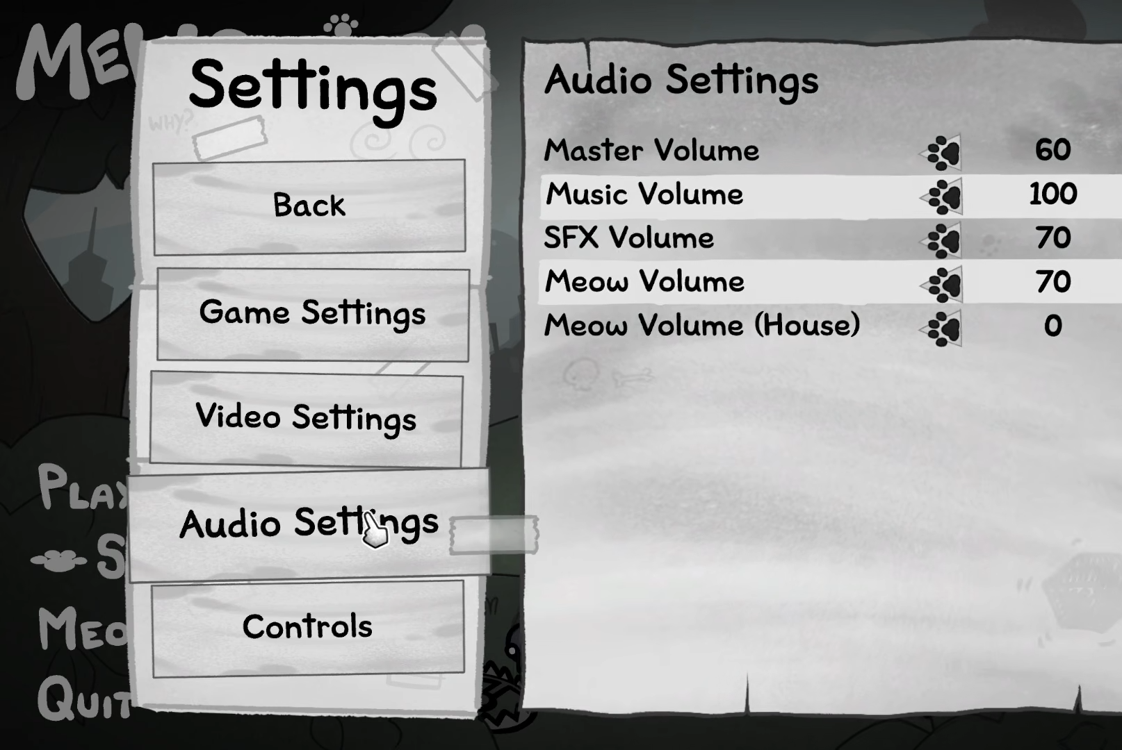 | Audio | Master, Music, SFX, Meow, Meow House (0-100) | Customizes sound without overwhelming meows during house management. |