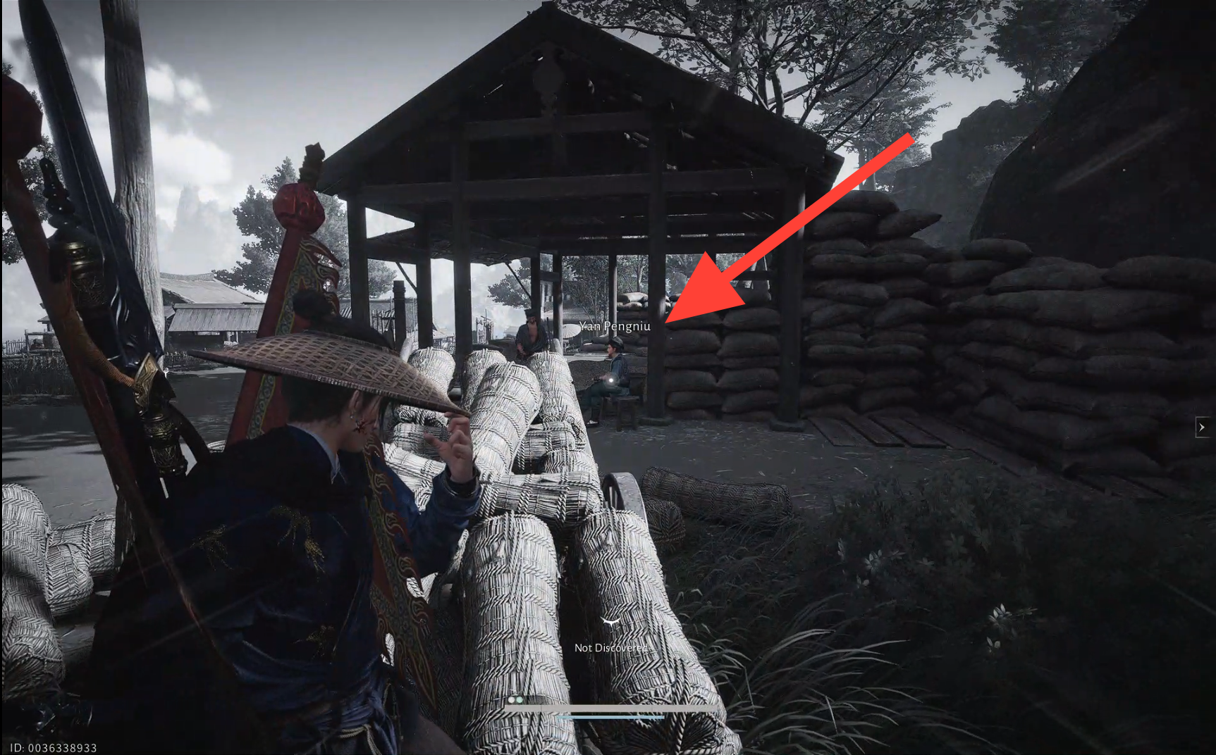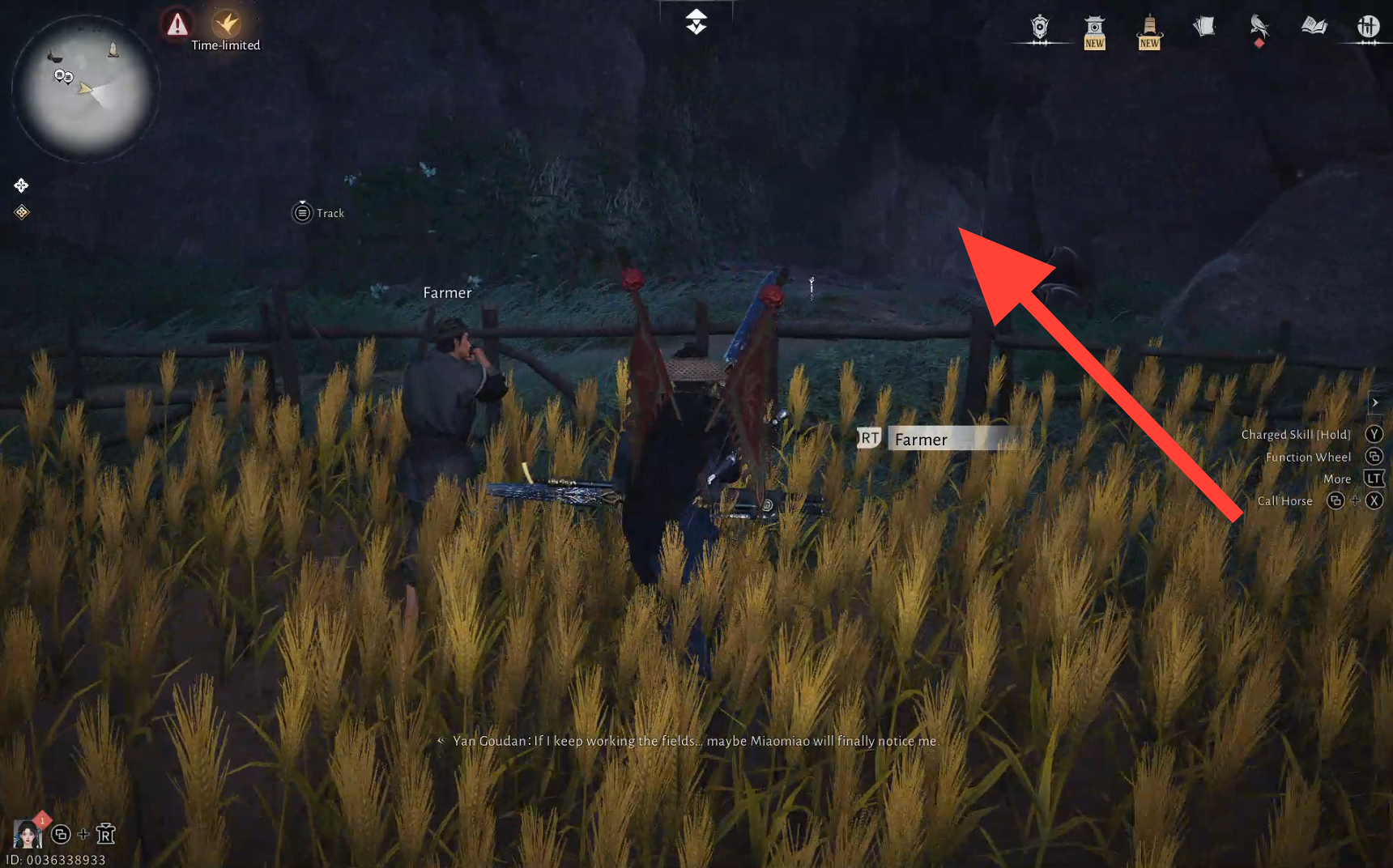 After trying to open the Granary door in Harvestfall Village, head to the marked location below and use Celestial Seize to steal the key from Yan Pengniu, who is seated under the nearby shed.