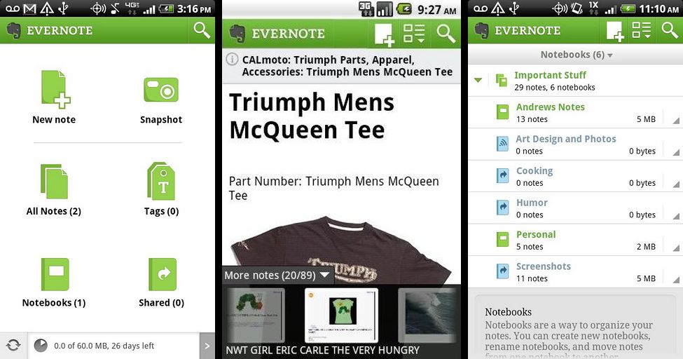 You start by creating a free account with Evernote, which gives you 60 MB of storage space per month. You can buy a premium account for $5/month or $45/year and get it upgraded to 1000 MB/month. Account creation is required the first time you use the application, but you do not need to use the online portion for subsequent uses. However, photos and voice notes need to be downloaded from the cloud every time you want them.