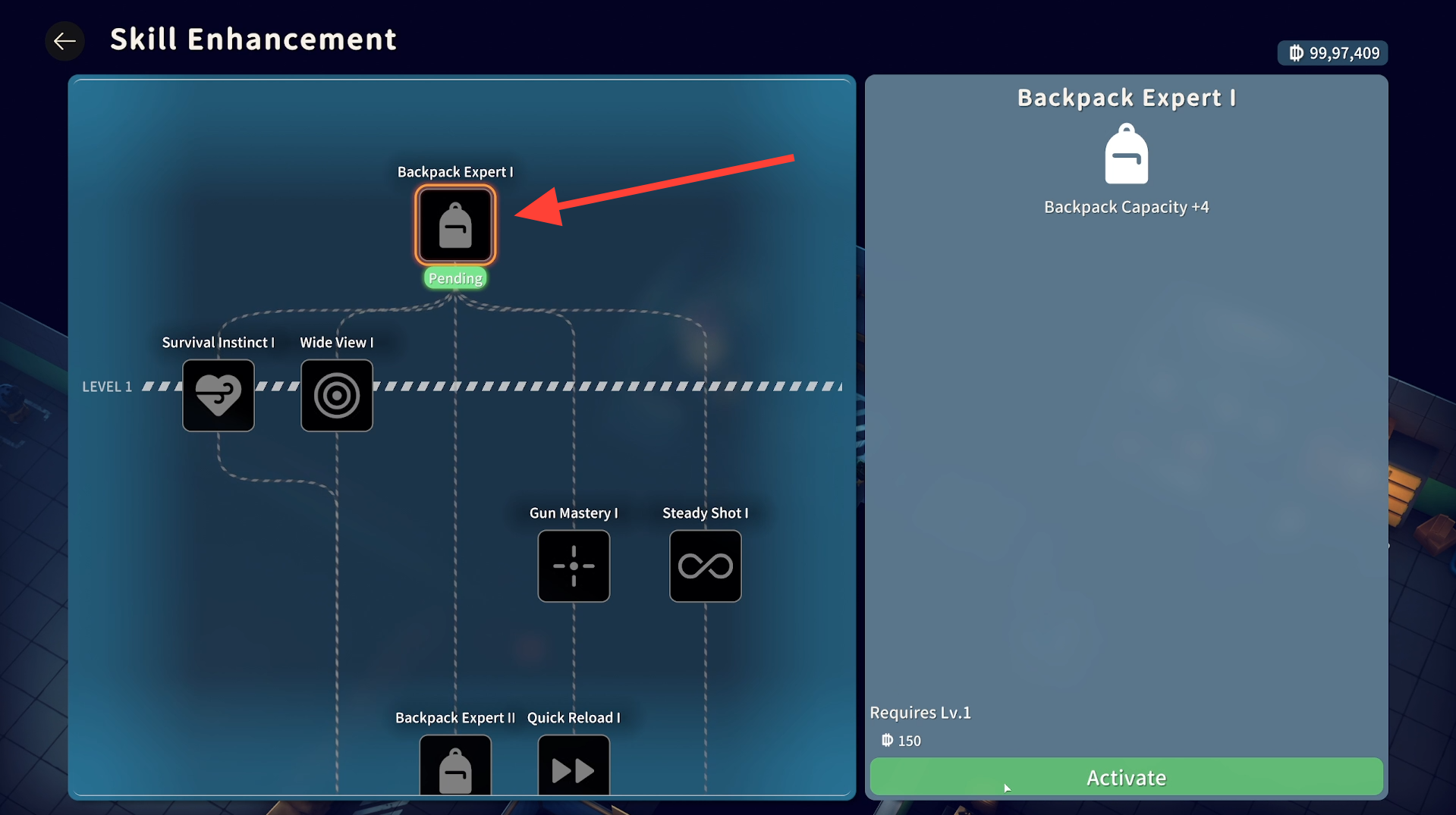 | Skill unlock | Backpack Expert I (increases inventory space) |