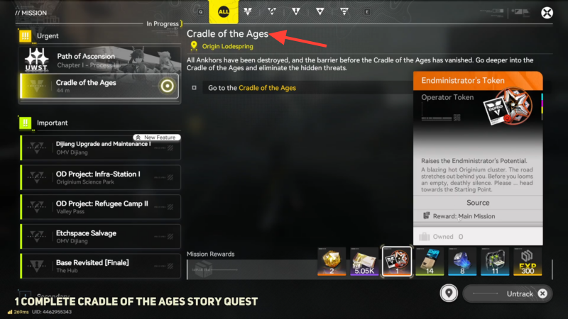 Open the mission menu and check the currently tracked main/story mission. If Exploration Level 4 is the target, the goal is to reach and clear “Cradle of Ages” first, because it’s part of the gate.