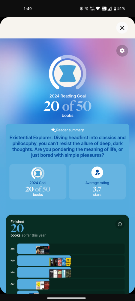 Like Goodreads, Fable lets you set yearly goals; similarly, it lets you track your reading and also see your stats. But what Goodreads doesn’t do is implement AI to give you a ‘Reader summary’ that defines what your reading habits tell about you.