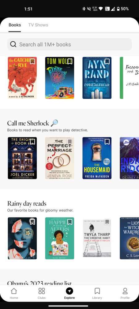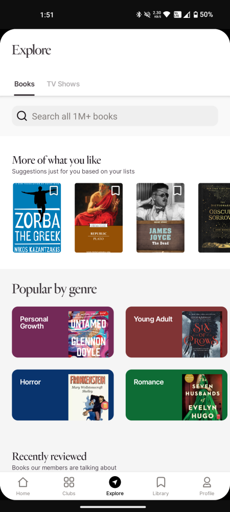 The more books you add to your personal library, the better your recommendations become. The ‘Explore’ option on the app is rich with titles and lists by others that you might like. You can browse books by genre, check out recently reviewed books, new releases, and tons of whacky categories like ‘Rainy day reads’, ‘Call me Sherlock’, and ‘Life-changing nonfiction’, etc. to help find the next good read.