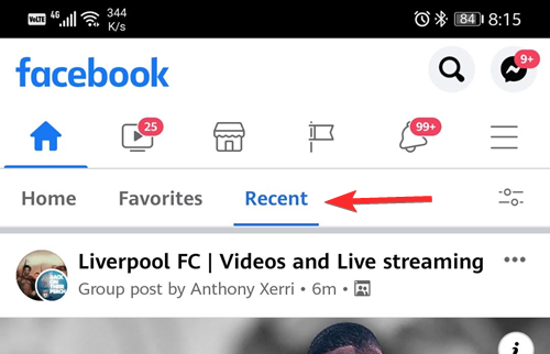 Next, you will see the three tabs at the top of your Facebook feed, one of which will be Recent.