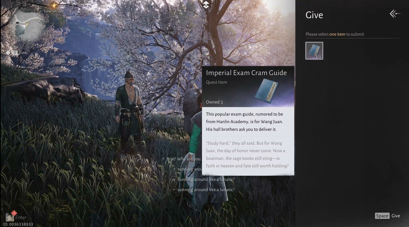 Head to Wansheng Dock. Approach Shen Qing and Yu Xian. They explain that Wang Juan has stopped coming to work and request that you deliver a special gift they purchased for him: the Imperial Exam Cram Guide.