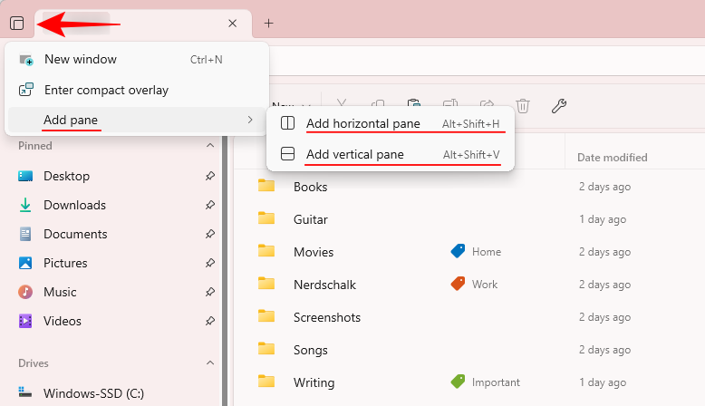 From the tab actions menu (top left corner), select Add pane, then choose to “Add horizontal pane” or “Add vertical pane”.