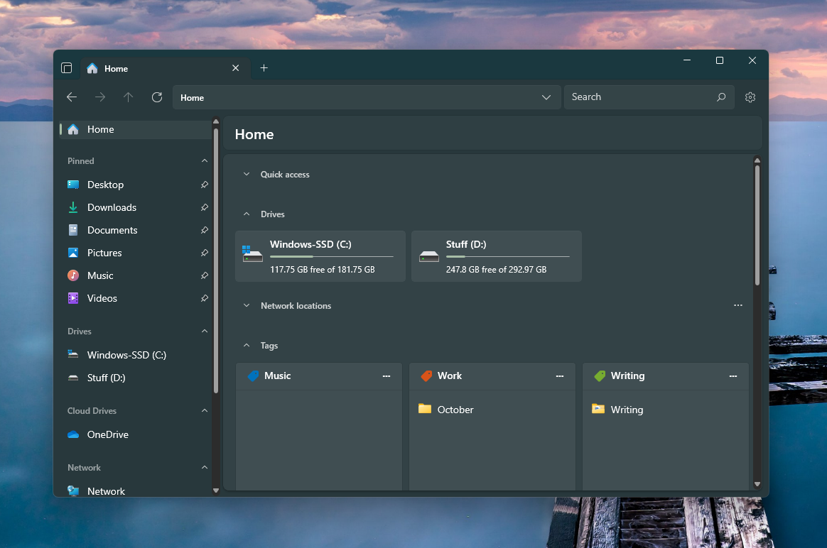On the native File Explorer, the Home page sections are limited to Quick access, Favorites, and Recent. But Home on the Files app includes all that you see on the navigation tree on the left, including Drives, Network locations, and Tags. It’s a much smarter implementation that ensures that your most-frequented pages are available everywhere.