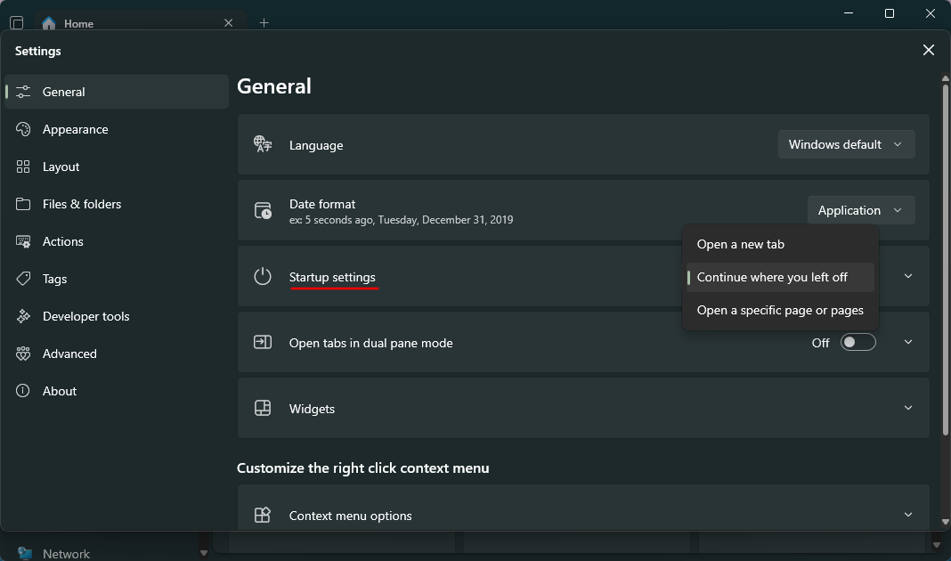 In the General tab, next to Startup settings, choose between ‘New tab‘, ‘Continue where you left off‘ or ‘Open a specific page or pages‘. If you choose the latter, make sure to Add page from the dropdown.