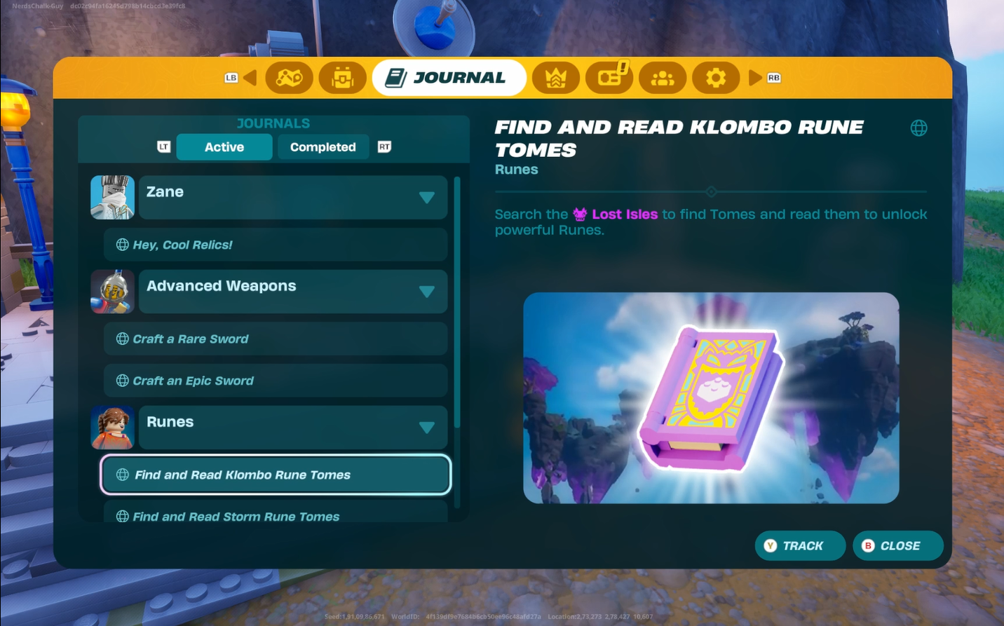 To begin the Find and Read Klombo Rune Tomes quest, open your Journal and track the objective from the quest list. Once tracked, head to a Battle Bus Station and use it to travel to the Lost Isles.