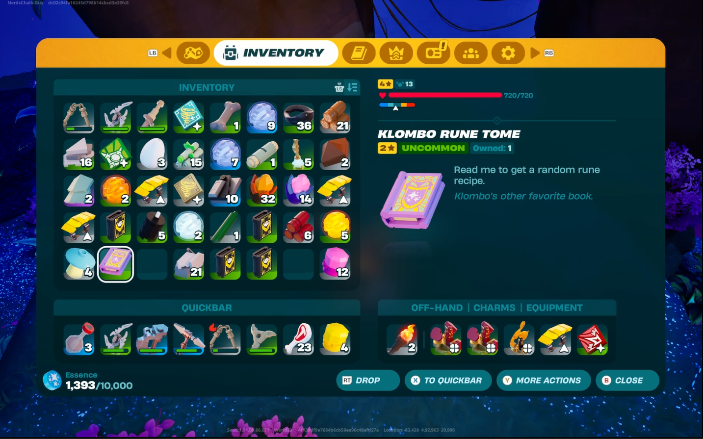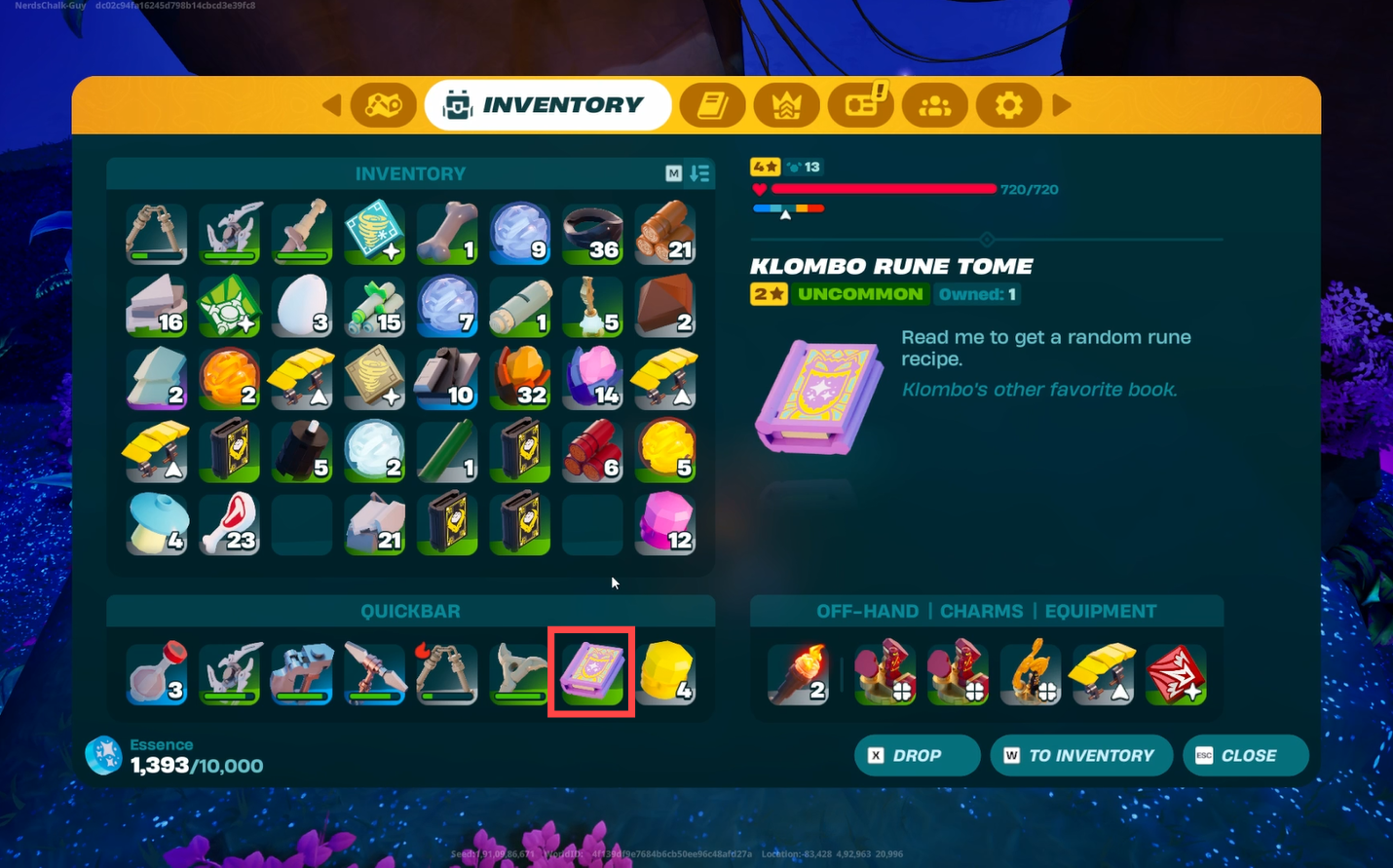 Place the Klombo Rune Tome into your Quickbar to access it.