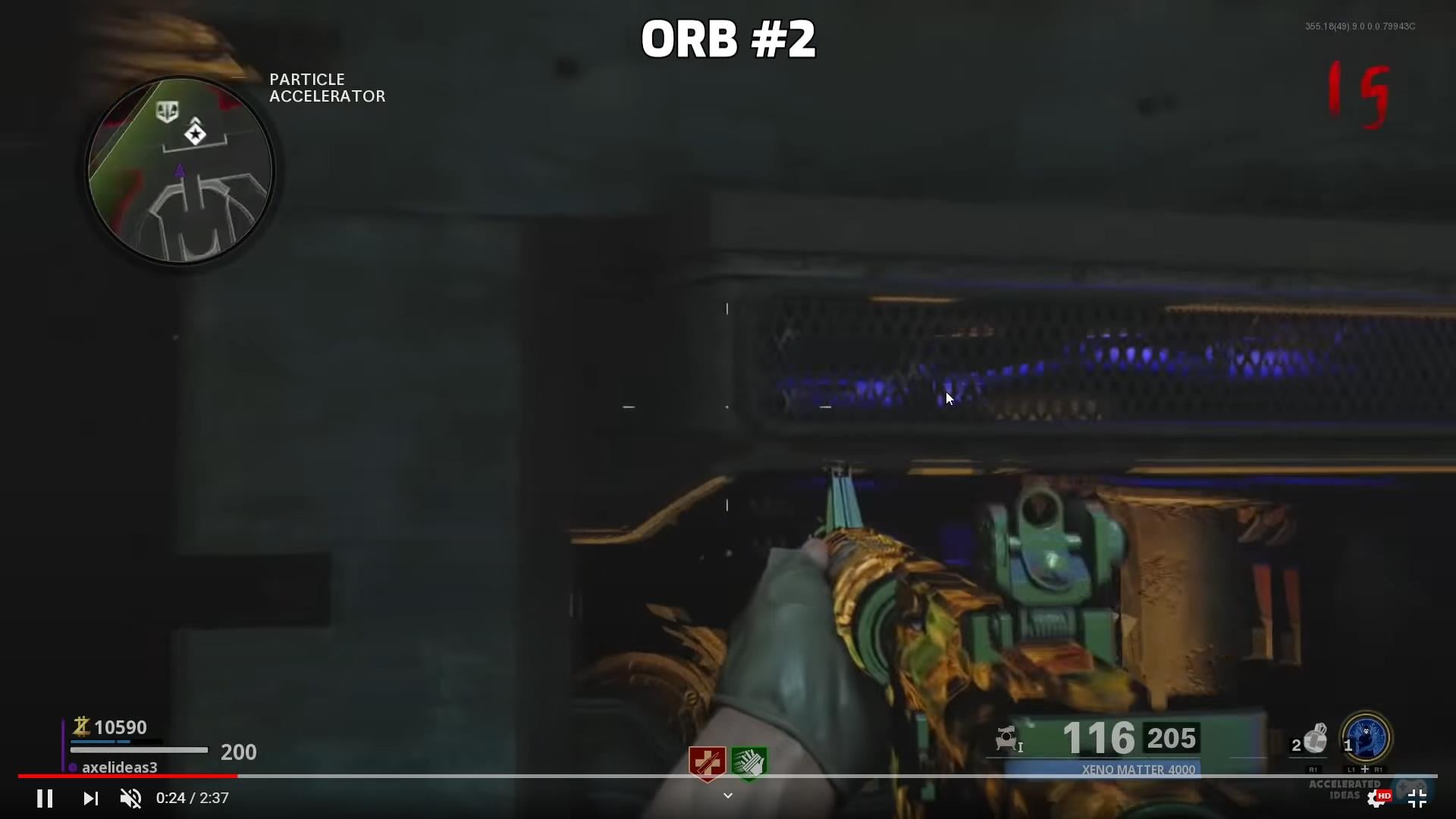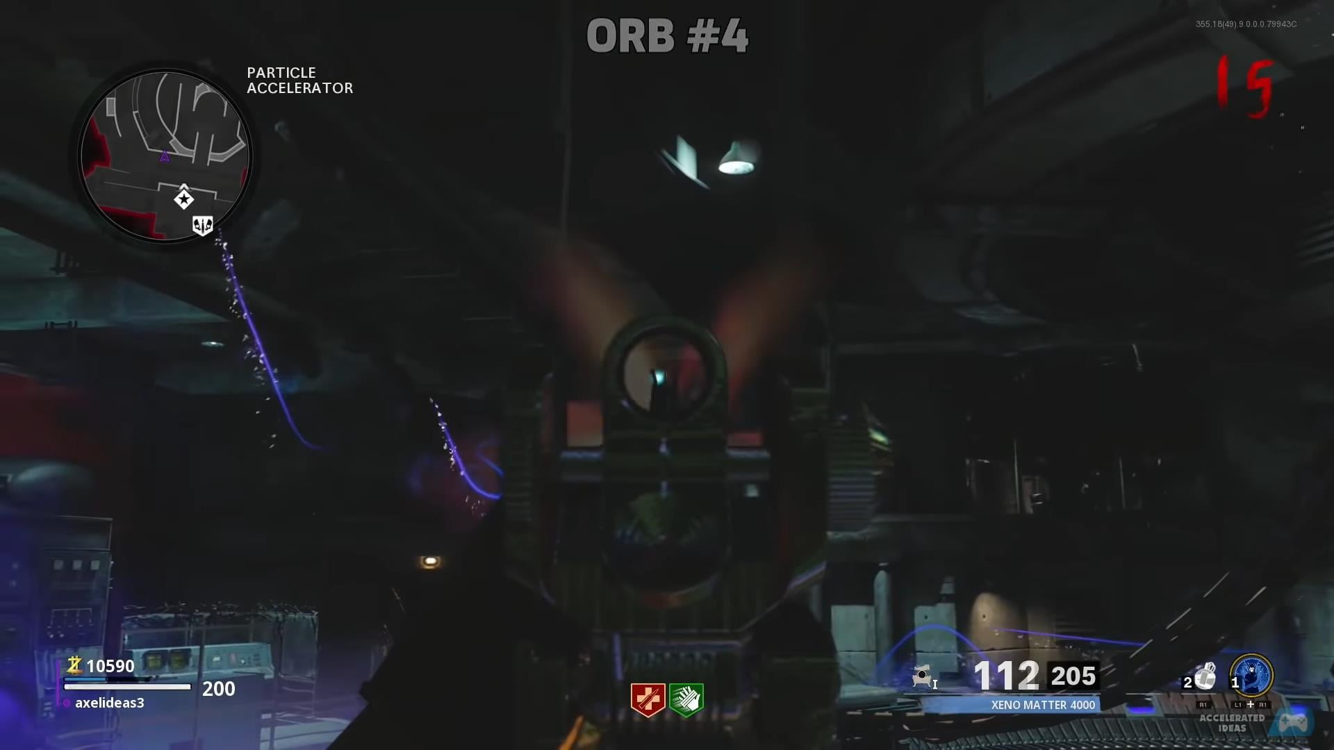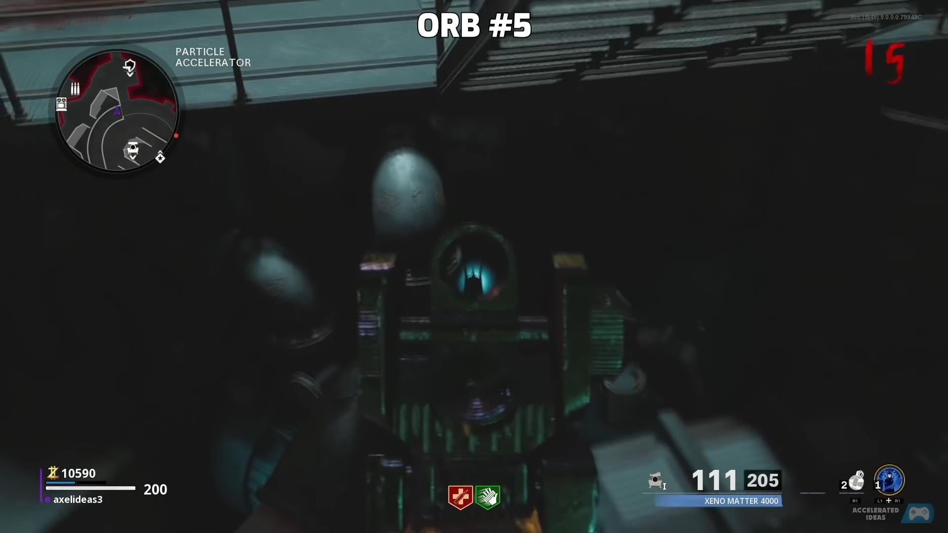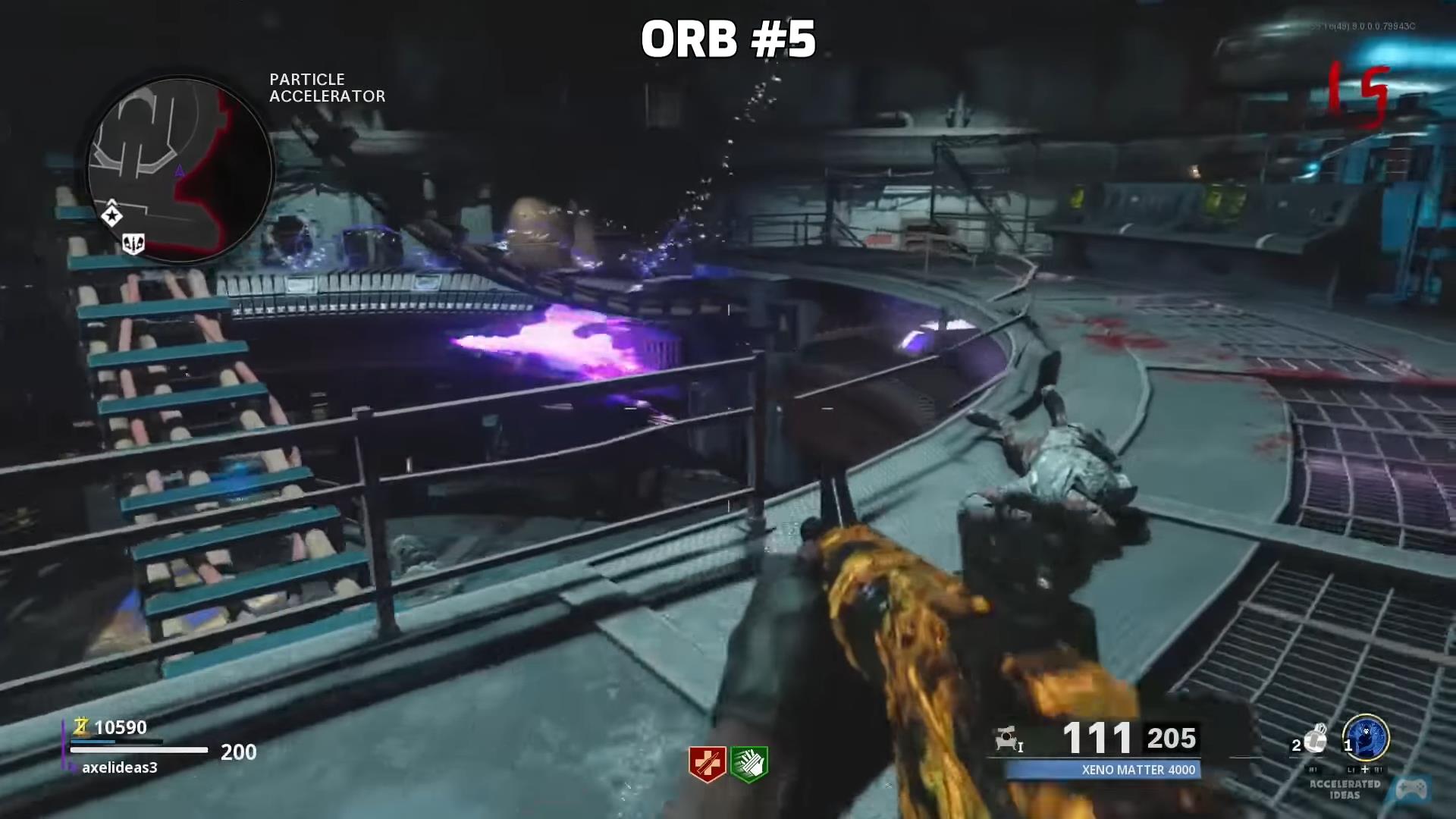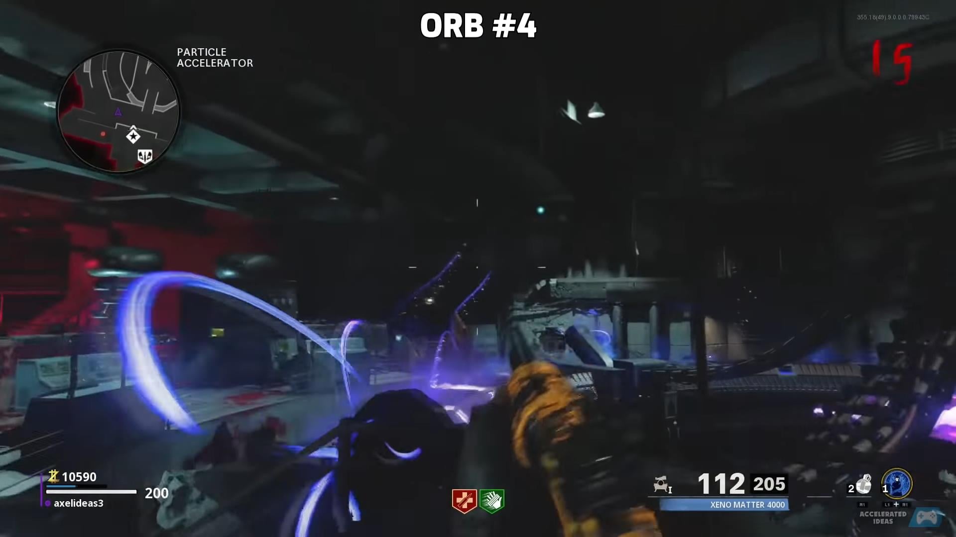 These are all of the 5 locations in the Particle Accelerator room where you’ll find each blue orb. You must shoot all of ’em in no order particular, to prompt the Easter Egg.