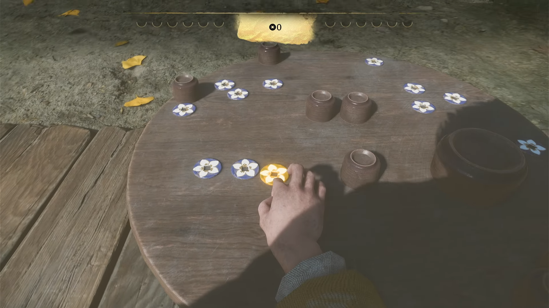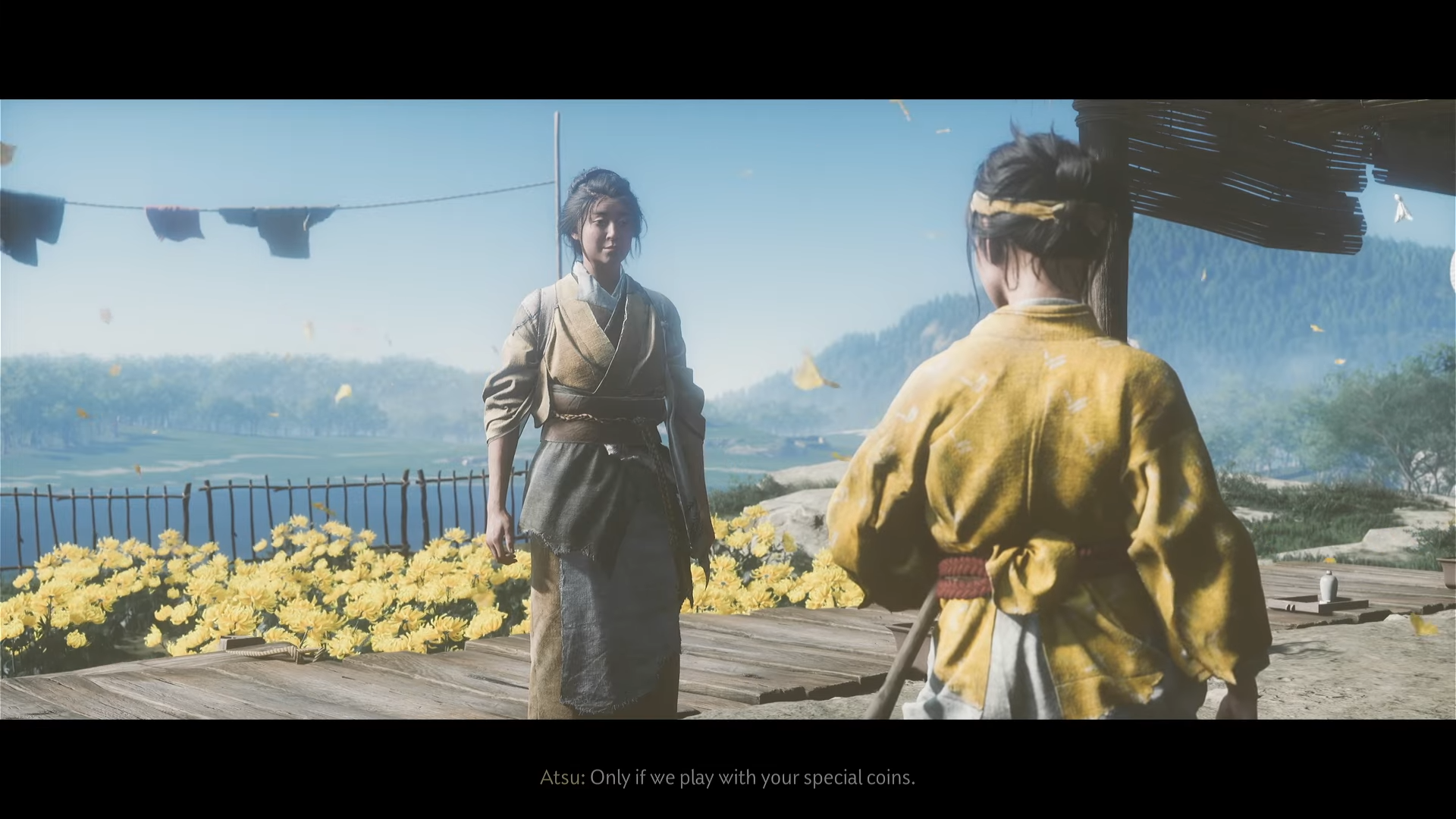 After collecting the paintings, shift again into the past by following the on-screen prompt. This time, you’ll meet Yone, your mother. She invites you to play zeni hajiki, a traditional coin game.