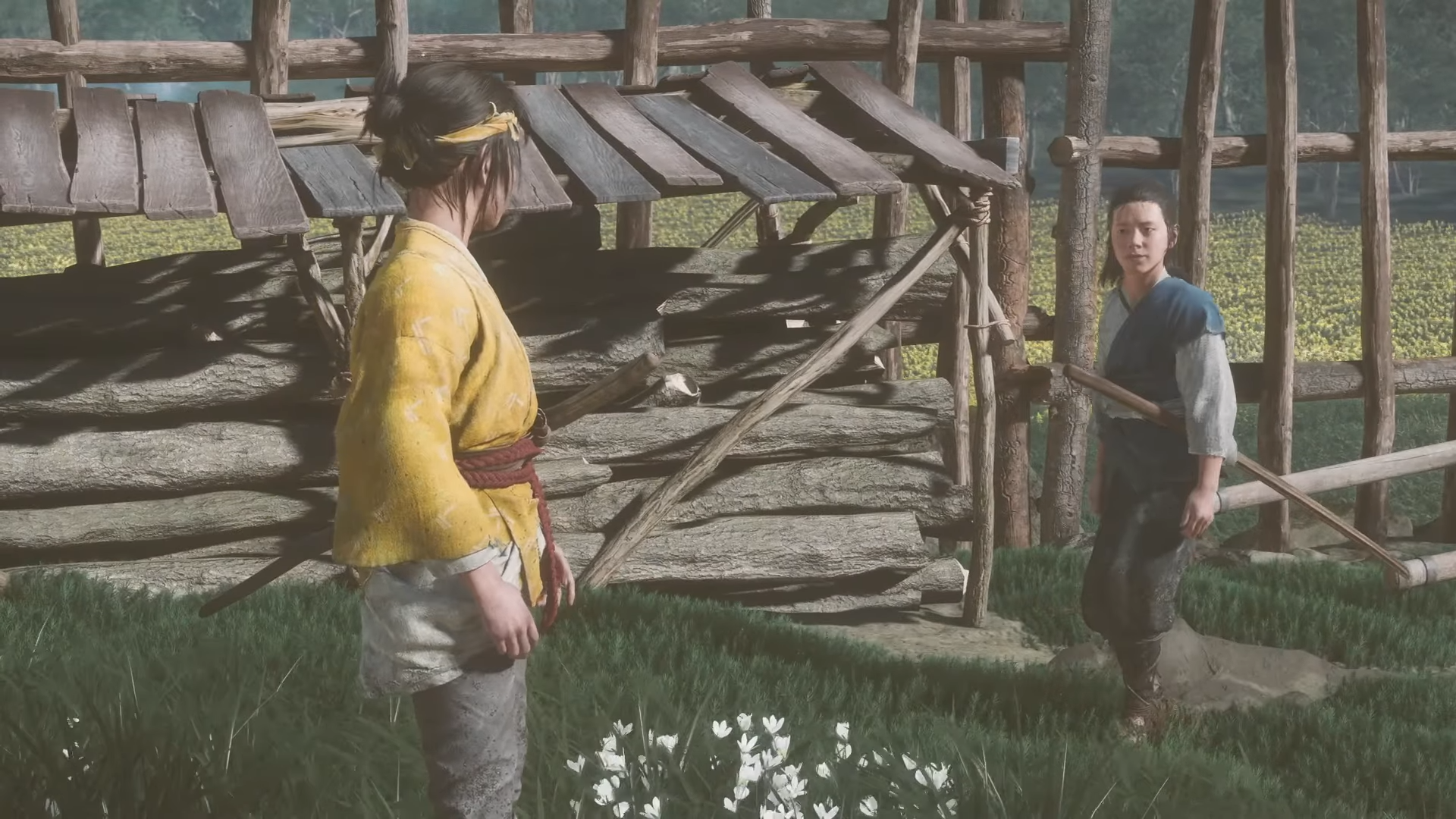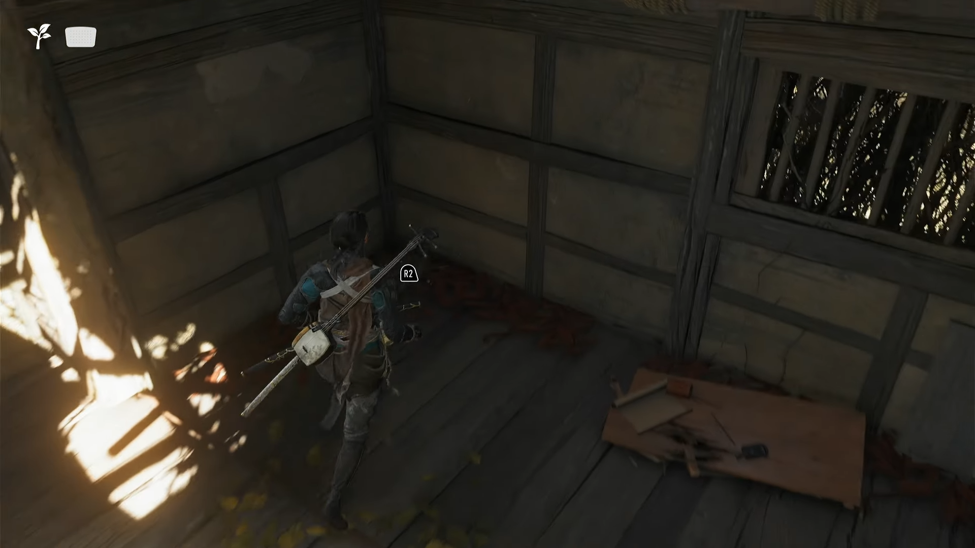 Once inside, the game transitions to a memory of your childhood home. Explore the area and speak with Jubei, the brother, who mentions his missing headband. This short memory helps establish the setting before sending you back to the present.