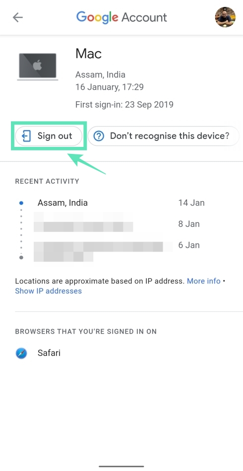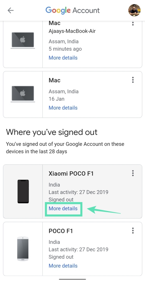 - Remove a device from your Google account: You can remotely unlink a particular device from Google by hitting More details at the bottom of the device boxes that are listed under the Where you’re signed in section. This section is present for each of the devices you’re signed into, so please make sure you’ve selected the right device. On the next page, tap on Sign out and upon bring prompted for a confirmation, tap on Sign out again. The newly signed out device will now be visible on the Where you’ve signed out section.