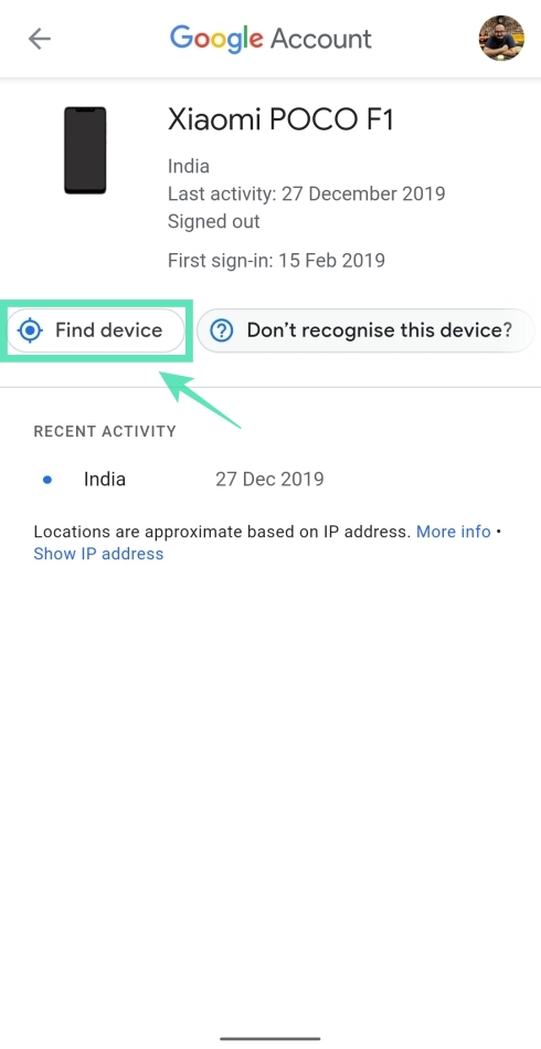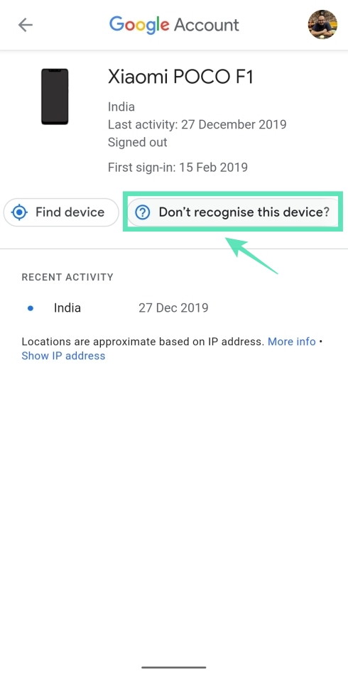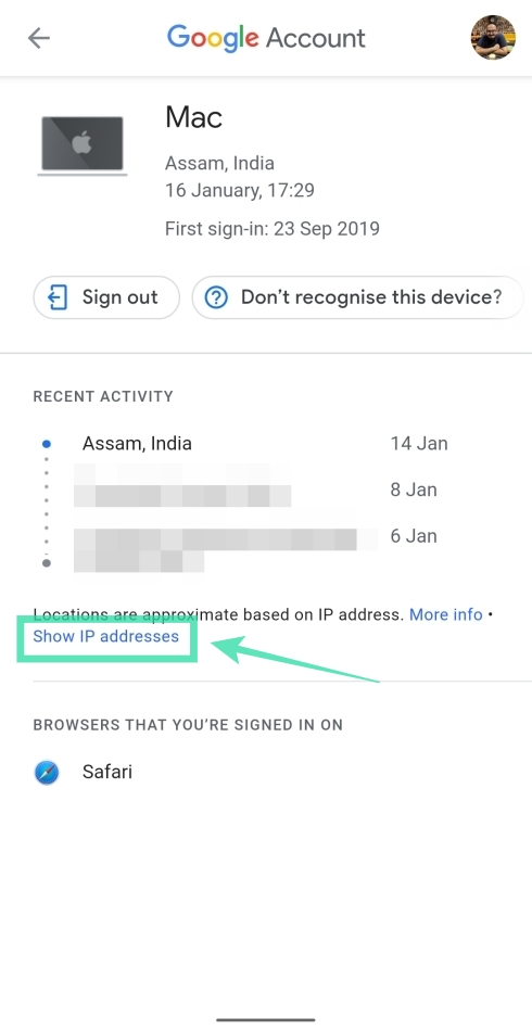 - View your device’s recent activity: You can see look at some of the past activities of a device including the IP address it accessed your account from. You can do so by tapping on More Details listed for a particular device. To view the device’s past IP addresses, tap on Show IP addresses.