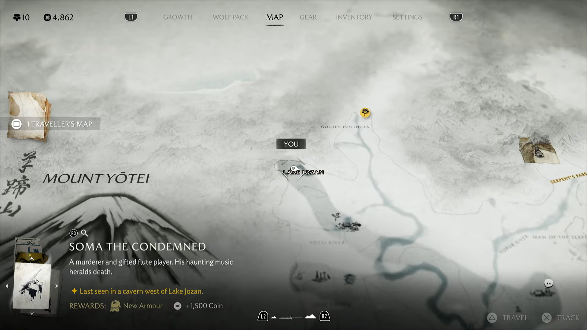 The bounty for Soma only becomes available after completing every normal bounty in the Yotei Grasslands region. Return to Kojiro at Yotei’s Shadow Inn, where he personally asks you to hunt down Soma for his musical crimes. Accepting this quest will place a marker at Lake Jozan, northwest of the Grasslands.