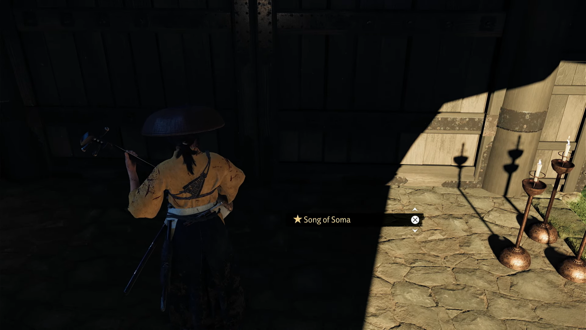 - Enter by playing “Song of Soma” on Atsu’s Shamisen near the door.