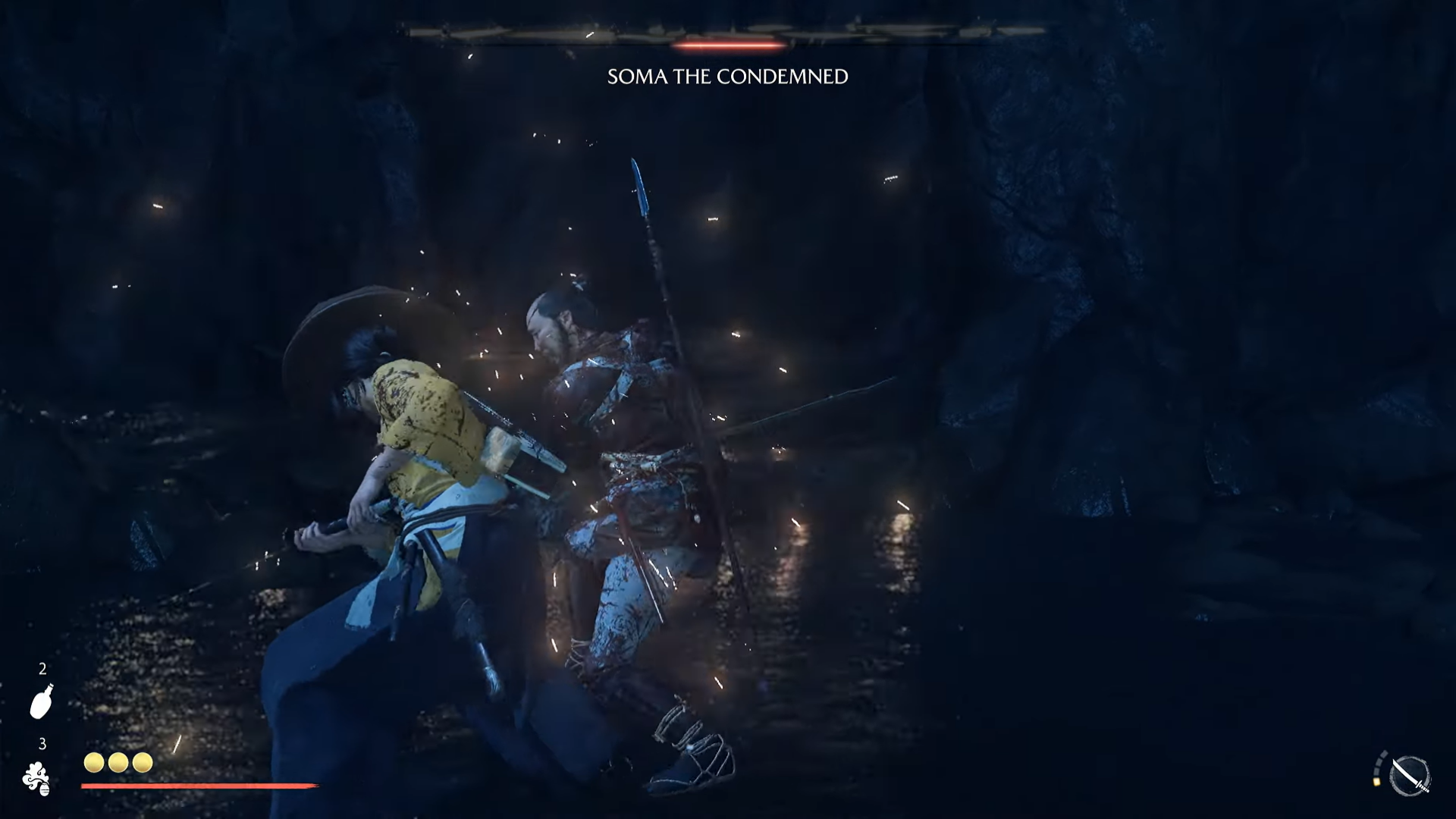 - Soma is defensive and relies on parrying; break his guard with heavy katana strikes.