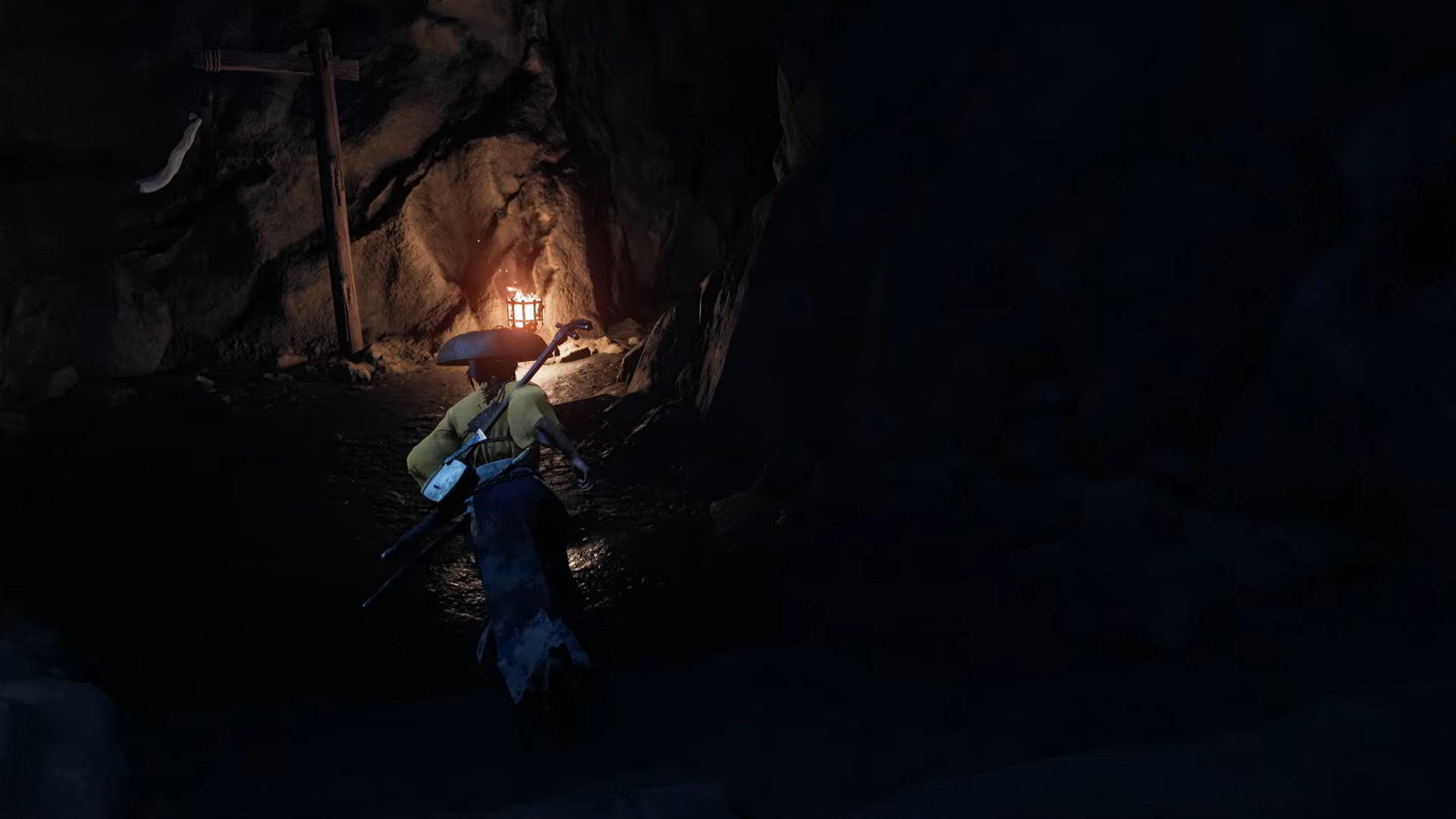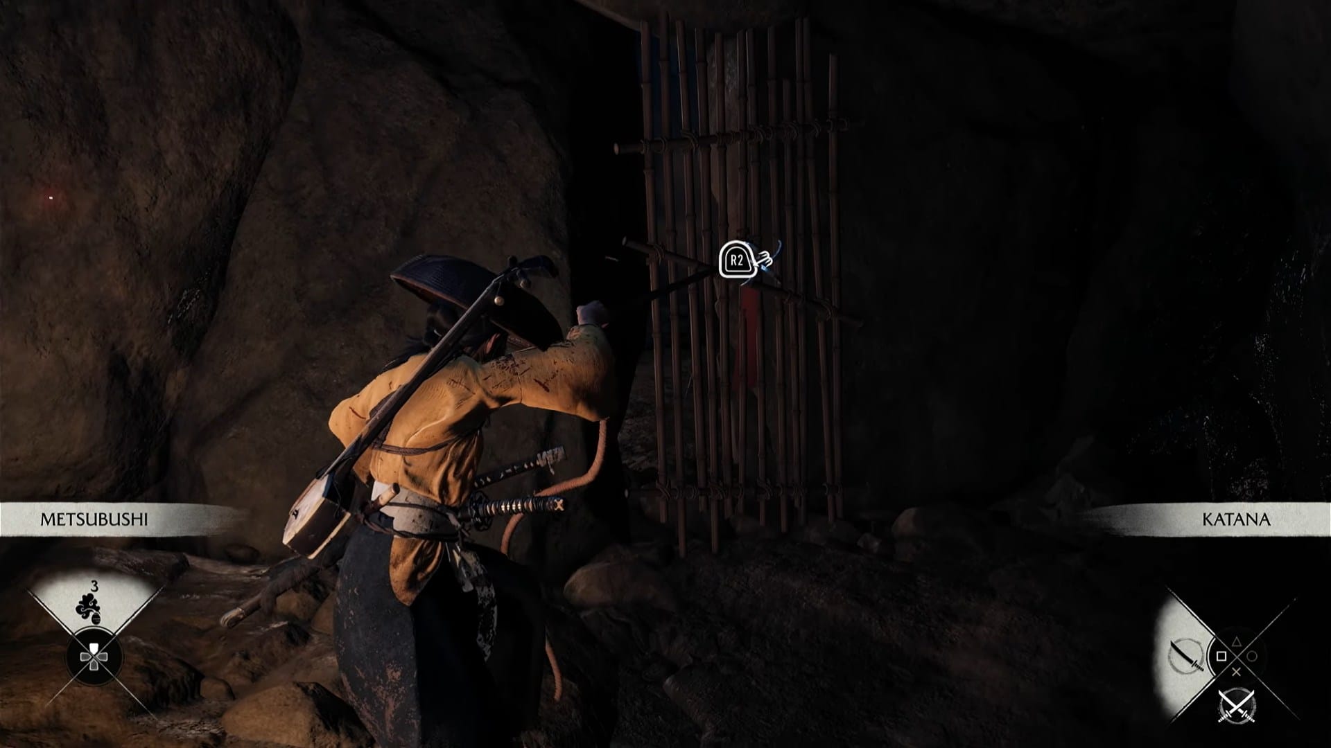 When reaching the crossroads inside, veer left and break the bamboo door with your grappling hook to progress.