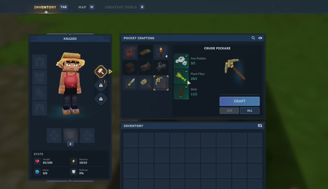 - Resource Gathering: Focus on collecting sticks, plant fibers, and rubble early on to craft your first pickaxe and survival tools.