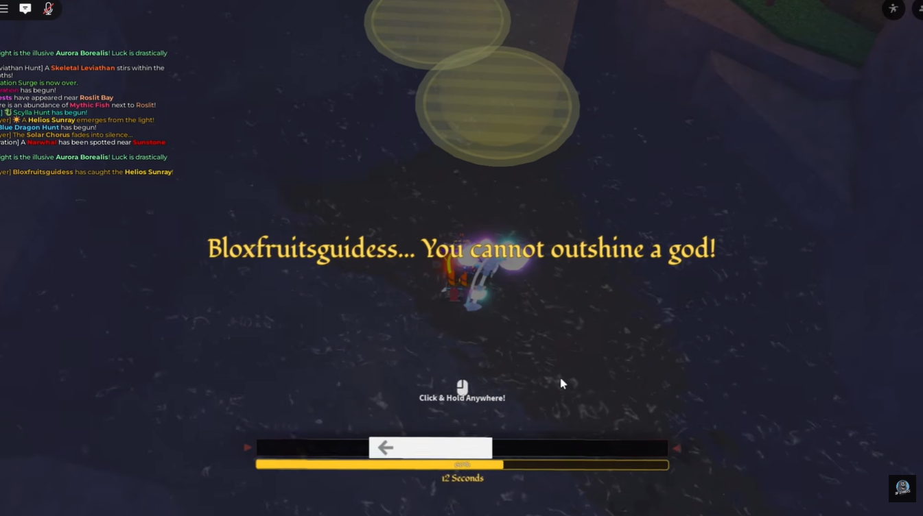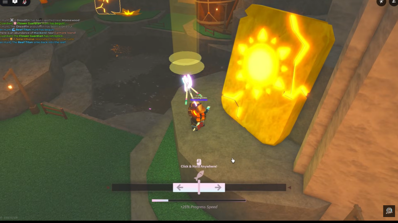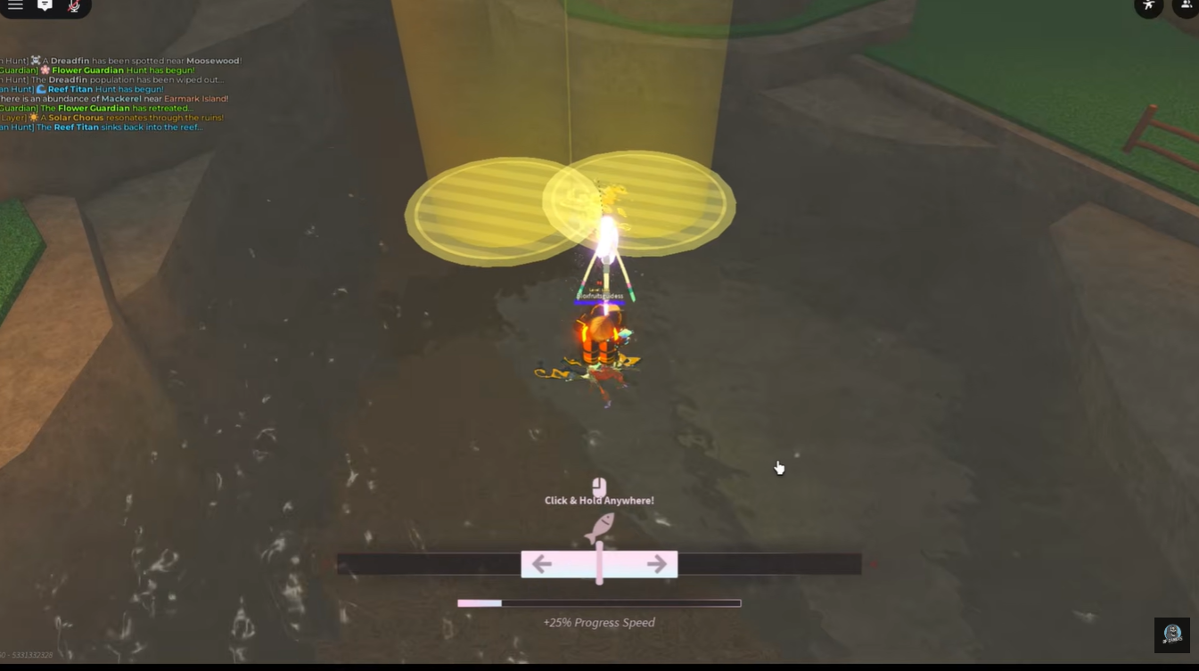 After activating all tablets, the game transitions into the Helio Sunray hunt. You are required to catch 25 legendary fish within glowing yellow light circles. This step is both time-sensitive and mechanically demanding, as you must maintain efficiency while targeting specific spawn zones.