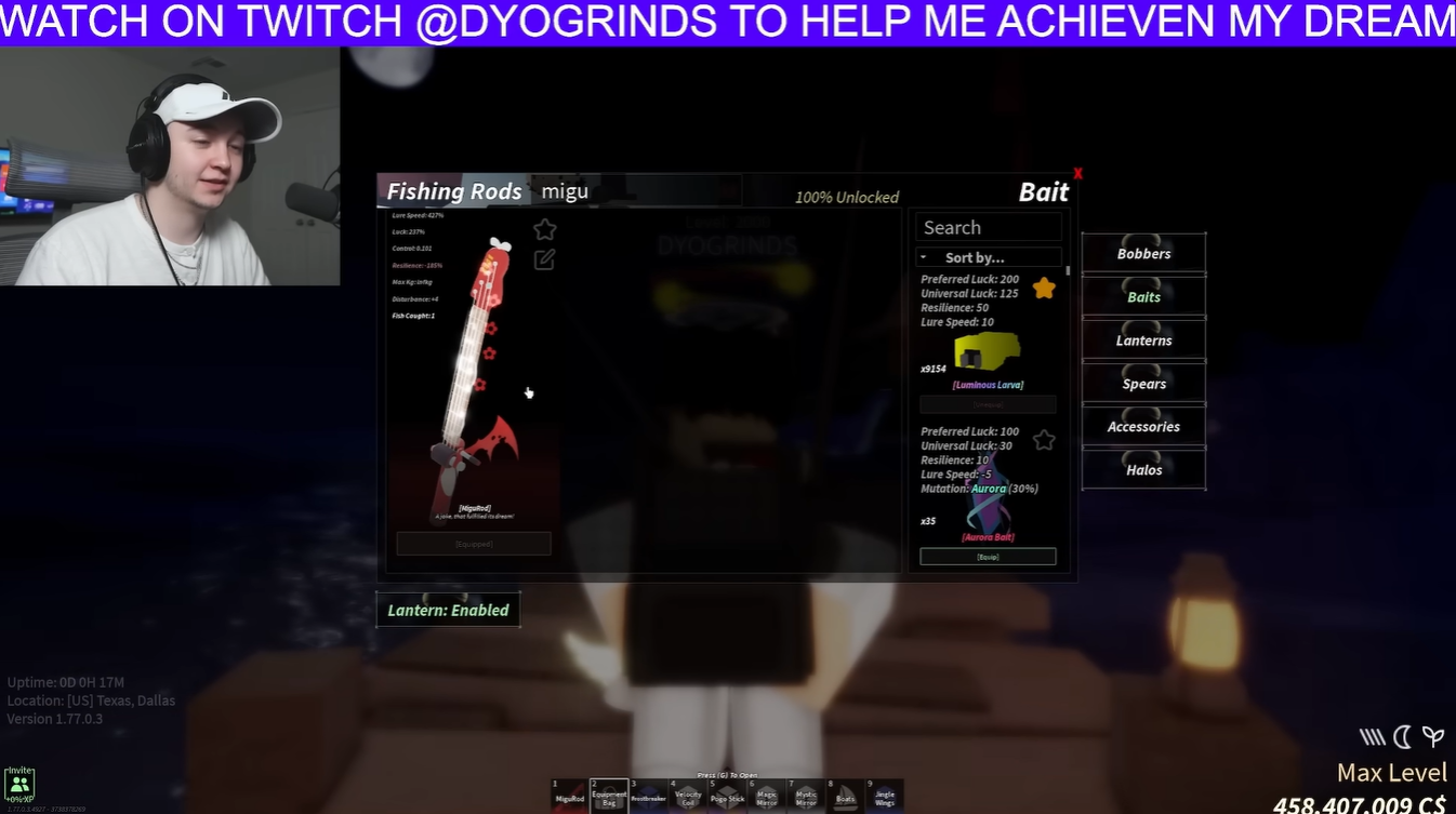 | Notable Stats | 427% Lure Speed, 237% Luck |