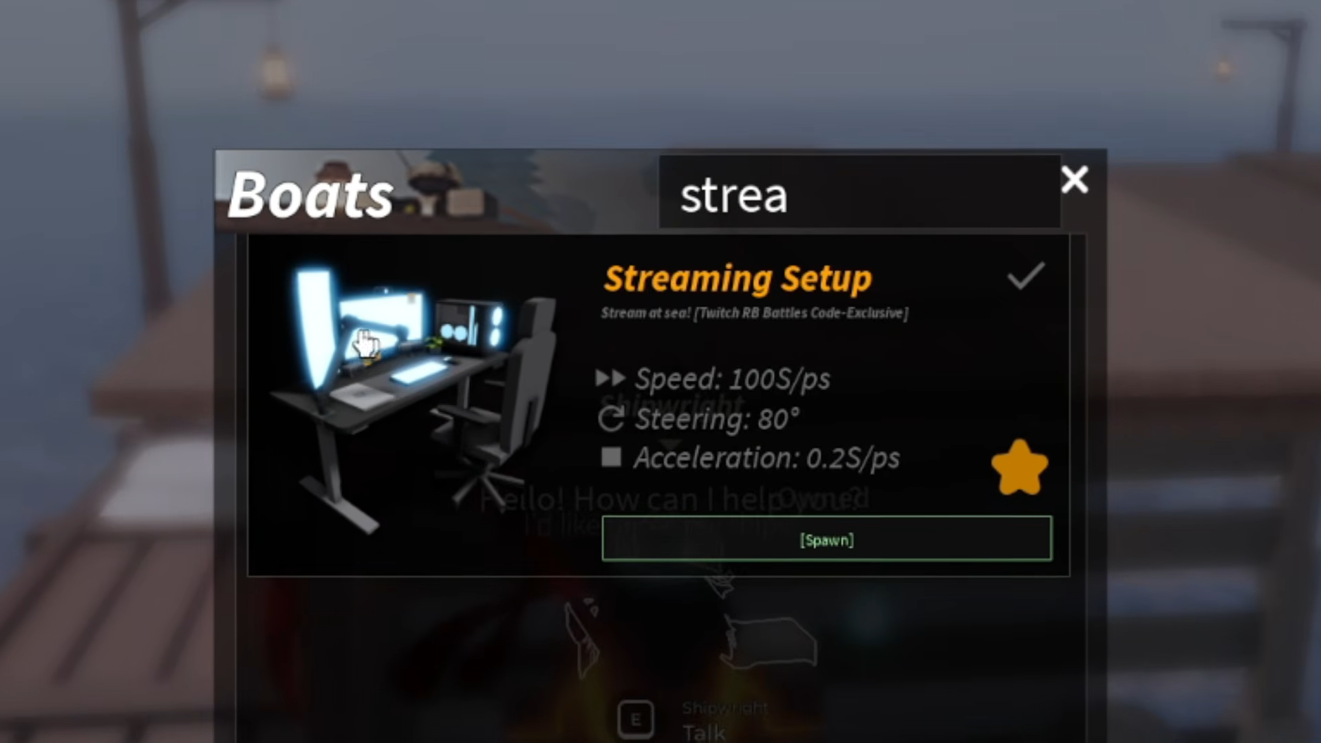 Grab this limited Streaming Setup Boat before the Twitch event ends, and elevate your Fisch collection with this unique ride. Sail out and show it off to other players.