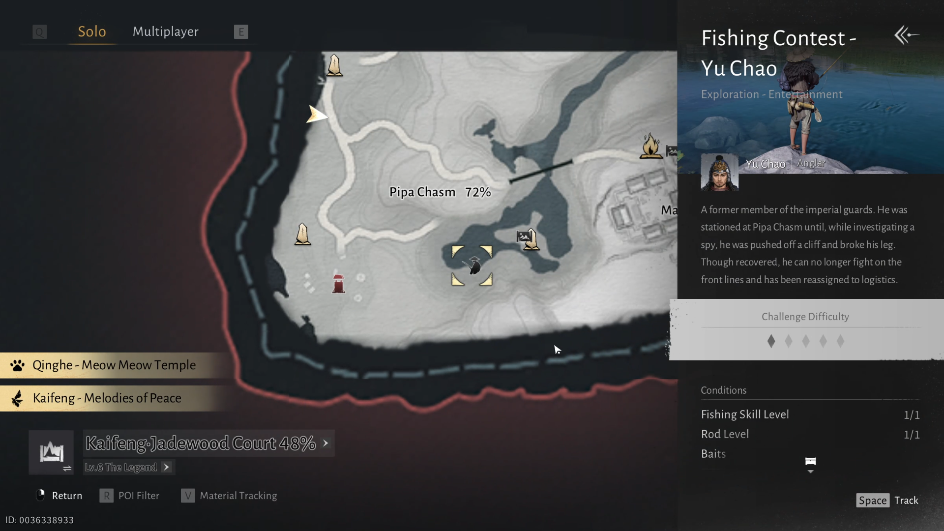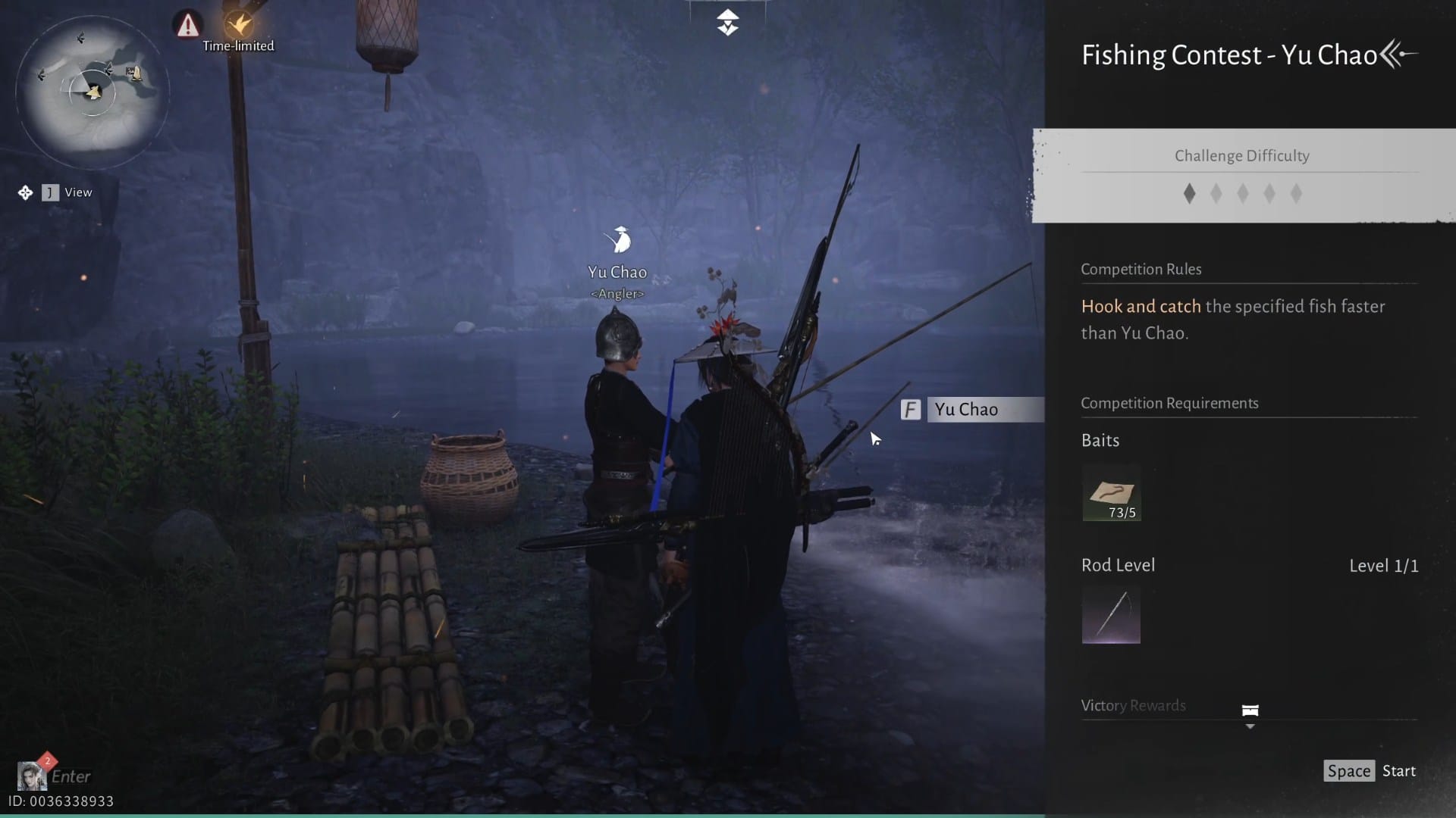 You'll need 5 Baits, Rod Level 1, and Fishing Skill Level 1 for the challenge. To start the fishing contest, simply approach Yu Chao and interact with him.