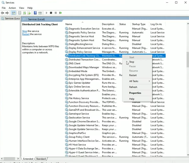 Ensure “Windows Update” and “Background Intelligent Transfer Service” run automatically. Also, make sure to Stop and Restart ‘Distributed Link Tracking Client‘.